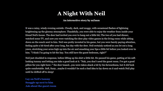 "A Night With Neil" is the first in, hopefully, a series of choose-your-own-adventure text games done in Twine focusing on my various characters. Hang out with Neil! Get banged by Neil! Get ate by Neil!