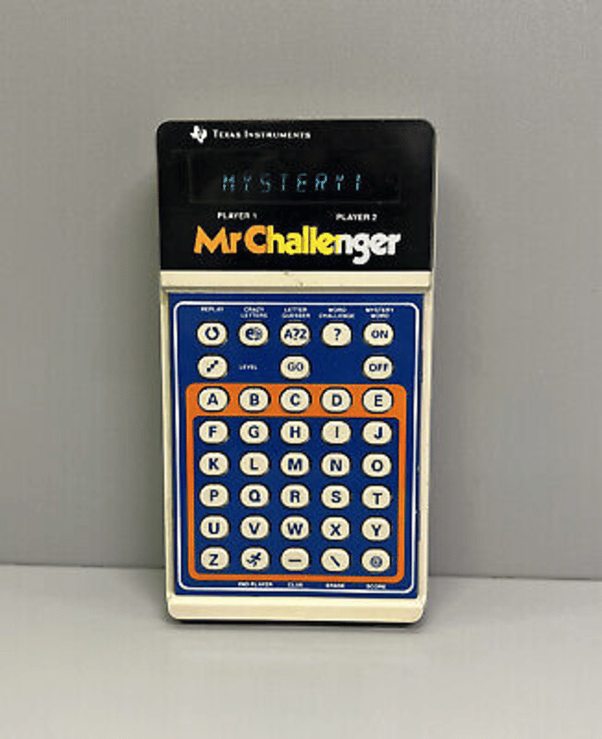 Mr. Challenger is a late-1970s Texas Instruments handheld electronic game featuring four word-based game modes focused on vocabulary and spelling challenges. It ships as a calculator-style unit and plays solo, emphasizing quick word recognition and anagram-like tasks.