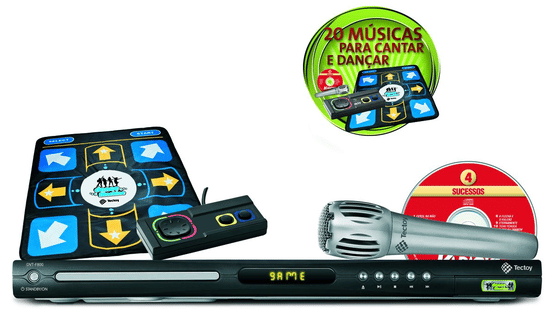 Tectoy's DVD Dancemachine DVT-F800 is a DVD player, a karaoke machine and a dedicated console all built in one single machine. It comes with one gamepad identical to the original SEGA Master System controller and a dance pad. It has 4 buit-in games, two played with the dance pad and two with the gamepad; each game has five songs and three difficulty levels. The included games are: Let´s Dance: a dance game to be played by one or two players with the dance pad. Movin': a singing and dance game for up to 4 players. In doubles, one player sings and the other dances according to the patterns shown on screen. Rock Show: a game similar to Guitar Hero, but instead of using a guitar controller the player uses the gamepad to press the notes as they scroll down the screen. Beat Game: a game for up to four players. In doubles, one player sings and the other plays the selected instrument (guitar, drums or keyboards) using the gamepad.