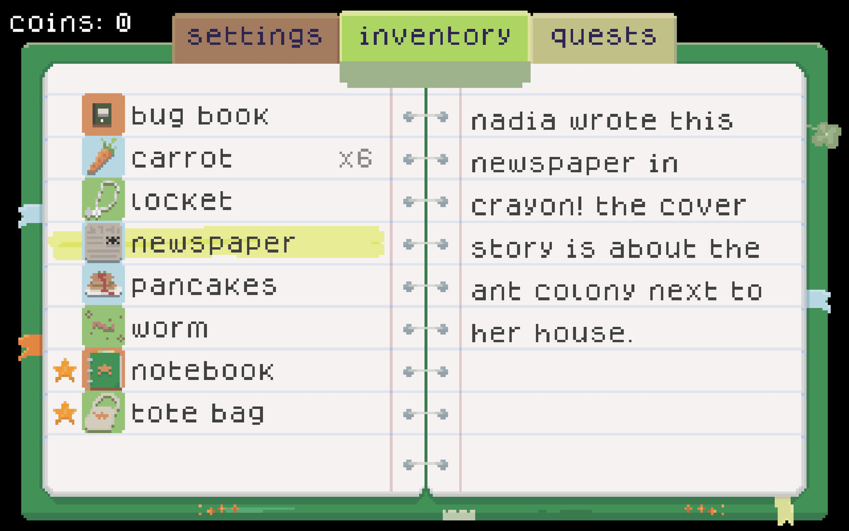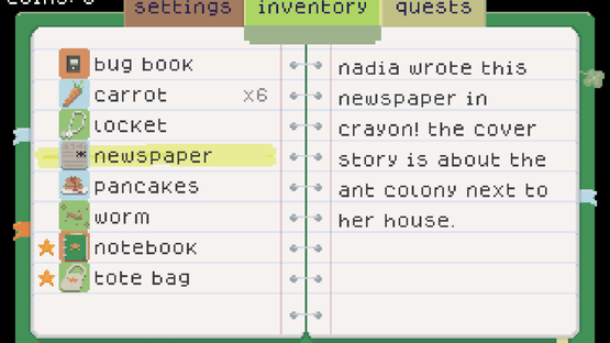 It's garage sale day! Embark on a small scavenger hunt throughout Lettuce Village's community-wide garage sale. In this story exploration game, you'll collect items with strange backstories, help your quirky neighbors, and maybe even uncover some of the town's secrets... Coming soon!