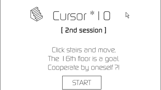Cursor*10 [2nd session] is the sequel to Cursor*10, a puzzle game where the player controls a cursor and the goal is to reach the sixteenth floor of a level in a race against time. During the course of the game, events will loop when time runs out and the player is able to cooperate with a past version of himself, as all the previous actions of the cursor can still be seen and influence the current session. As such, eventually up to ten cursors will cooperate to reach the sixteenth floor, clicking boxes to open them, mounting stairs and pressing buttons simultaneously. The graphics are drawn as outlines in black and white, shown from an isometric perspective. This edition features both recurring and new puzzles, including a deadly spear that can pin your cursor, instantly killing it, and a key to unlock a box. This version also introduces sound, unlike the first game. Apart from that, the gameplay mechanics are completely identical.