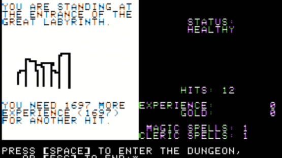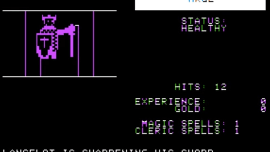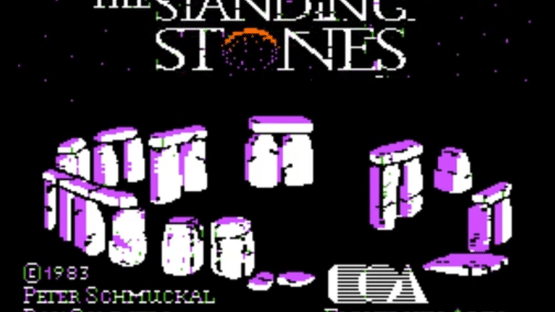 The Standing Stones is a dungeon crawler set in Arthurian legend, where players embark on a quest to recover The Holy Grail and Excalibur from Kormath's underground lair. As a knight aided occasionally by Lancelot, players navigate through a 3D maze-like dungeon with grid-based movement. Character creation involves randomized stats across five traits - Virility, Intellect, Holiness, Agility, and Initial Hits. The gameplay combines exploration, treasure hunting, and random combat encounters with Kormath's minions, which can be handled through combat, bribery, or greetings. Players can collect magic items, potions, and rest during their journey, with a save game feature available to preserve progress.