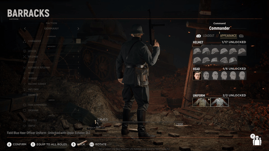 Unlock access to join the Upper Echelon and take command of the front lines with these unique uniforms for the Commander Role. Show off your rank and station with the "Field Blue Heer Officer" uniform for the German forces or stride out in your "Summer Service" uniform for the US.