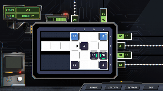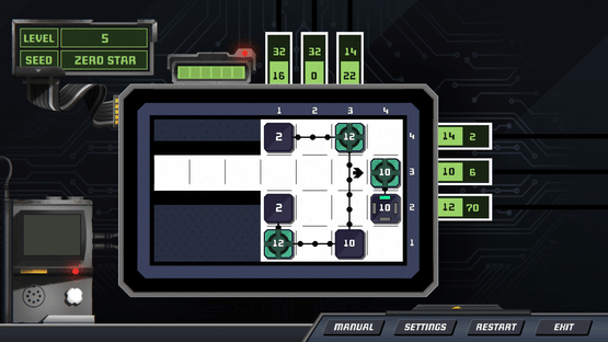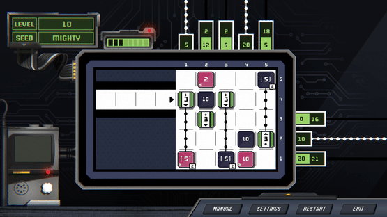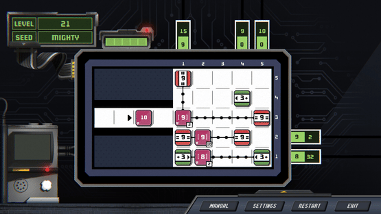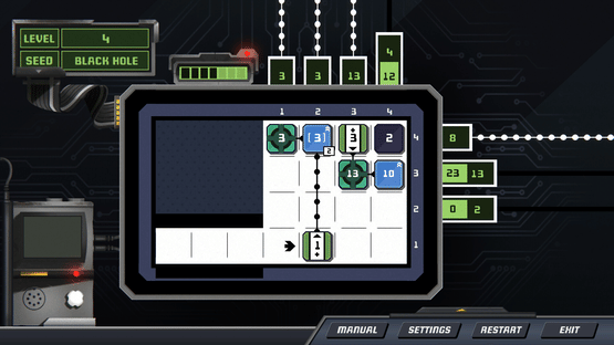 A logical puzzle system about arranging boxes to make the numbers add up correctly within a grid. The boxes react to each other in mathematical and logical ways, and you manipulate them within the constraints of a machine that comes with an elevator attached!
