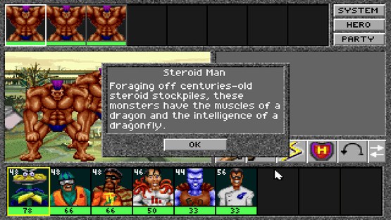 Superhero League of Hoboken is a hybrid of adventure and role-playing, set in a post-apocalyptic wasteland in the Northeastern United States. Toxic pollution and war have reduced the United States to a state of anarchy, except for the occasional city-state. Almost the entire area is covered by water, and dangerous mutants roam the wasteland. The player takes on the role of the Crimson Tape, the new leader of the Superhero League of Hoboken, imbued with the amazing power to Create Organizational Charts. The United States is a nightmare land of toxic waste, melted ice caps, and desperate shortages of oat bran. Horrible mutations roam the countryside... monsters spawned of radiation, environmental toxins, and unregulated bio-engineering. But in a tiny corner of New Jersey, a small group of Superheroes has banded together.