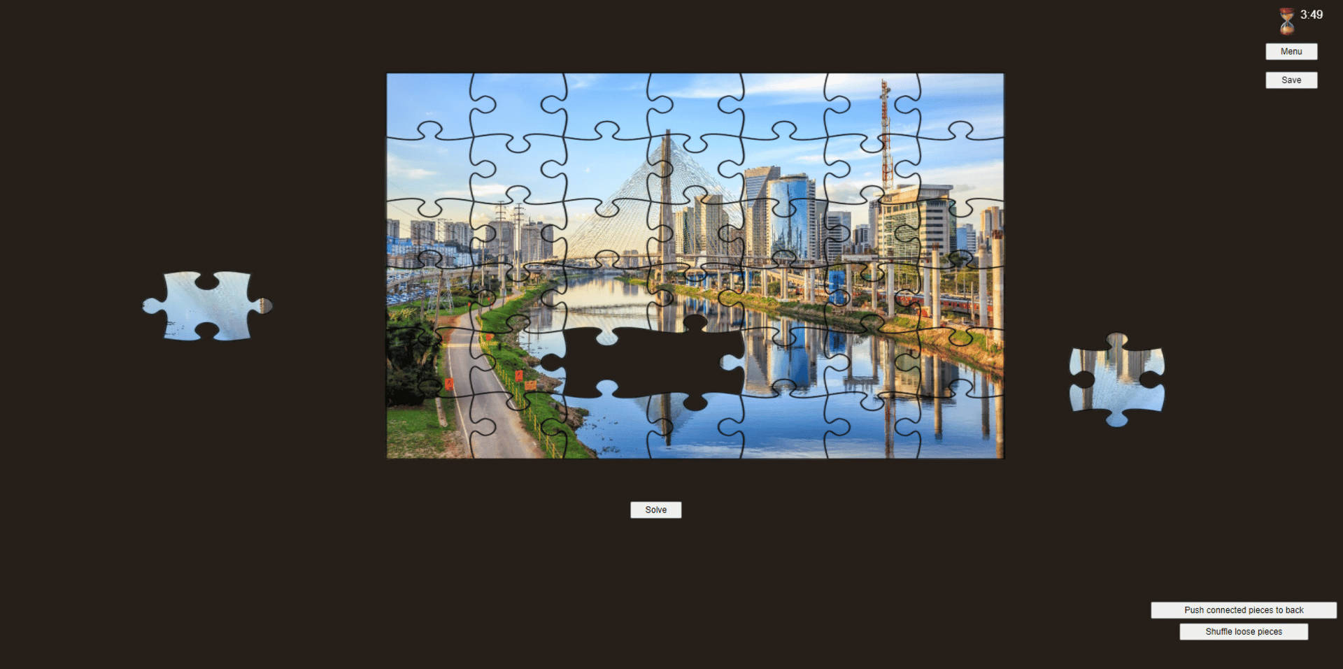 Do puzzles in a new puzzle way! Advanced puzzle layout and involving gameplay will help you to relax after a hard-working day. The player can choose to play with 30, 42, 117, or 285 pieces.