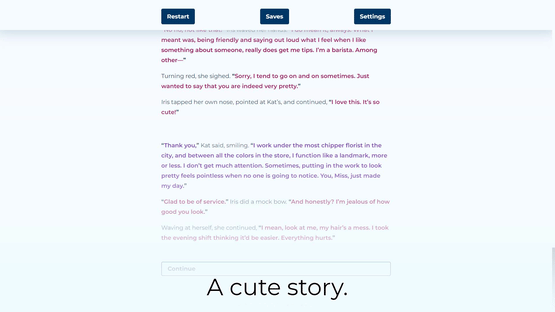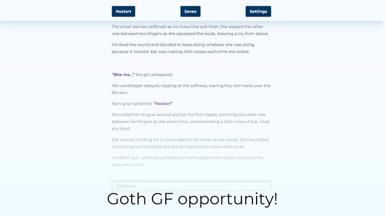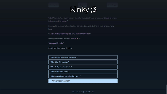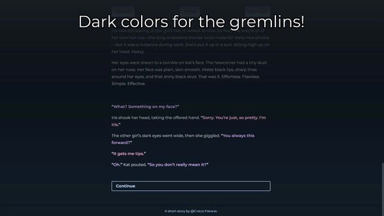 This is a short story about two girls meeting one night, taking a liking to each other, and exploring themselves further. Weighing in at around ~7.5k words, it is more akin to a kinetic novel, except for the lack of images.