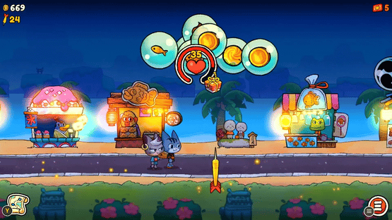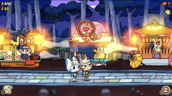 Kimono Cats is a charming, easy to play game for all ages. Select your main-character cat and a companion-cat, and walk through a Japanese "matsuri" Festival, making your companion happy. Throw darts at moving bubbles to give your companion a gift from a stall, play a mini-game, or encounter characters. Earn coins, to progress along the road to new areas that have new things to discover. Coins also allow you to purchase houses, shops, and decorative objects to design and build your own unique village. You can take care of your village and visit other players' villages, earning bonus coins, leaving gifts, messages, and stamps in their guest books. Play online or offline. Kimono Cats is designed to help you smile a bit more every day.