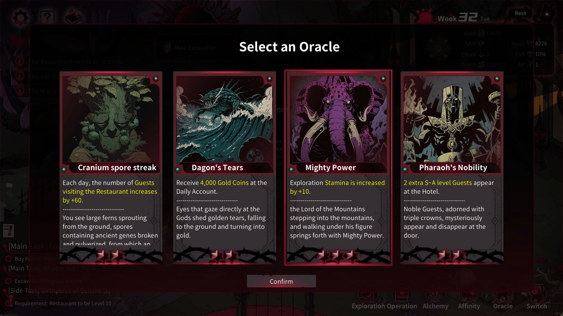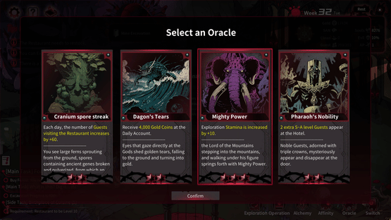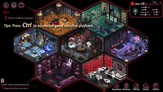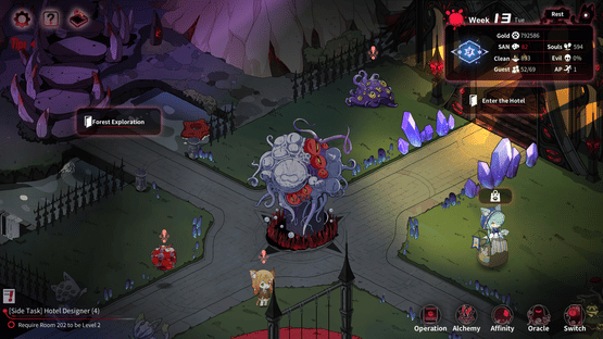 Manage a hotel and hire employees including Death, a dragon, a Demon-Slayer, and a bioroid maid. Build your wealth through various means and refine your strategies based on the predictions of Oracles. Your choices will determine which employees become enamored with you.