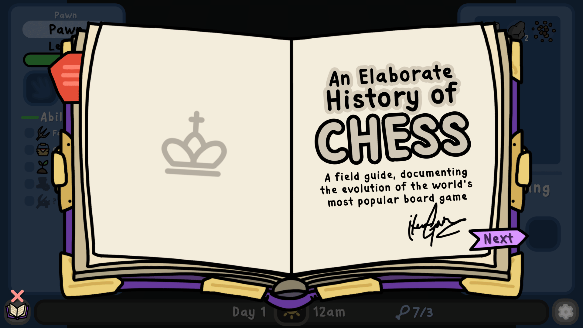 An Elaborate History of Chess is a crafting strategy game touring the history of Chess. In true Chess tradition build castles, explore dungeons, farm turnips and get checkmated by a tree. Find answers to Chess's darkest questions, like why the horse piece moves in an L-shape.