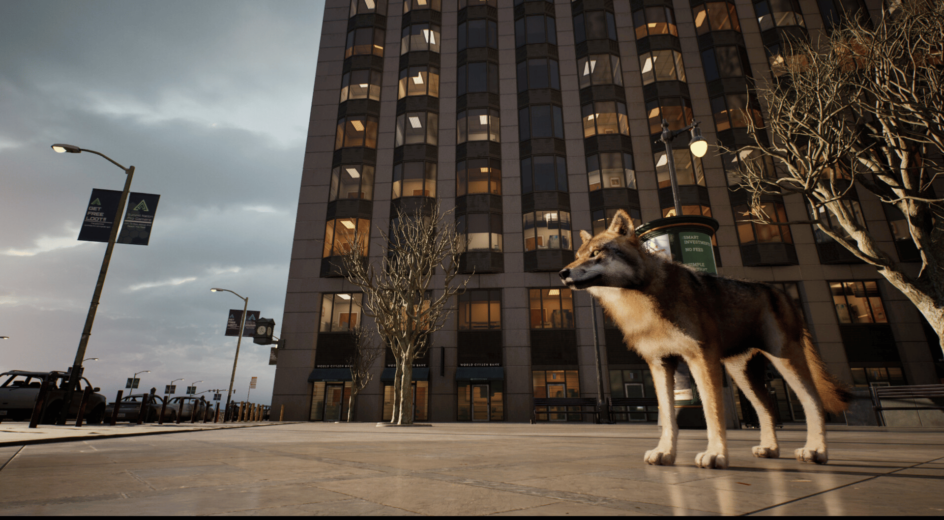 A lone wolf whose children have been kidnapped from an animal shelter and is looking for his children in a Big city. He will need to find food and track to survive. As the wolf, run through the streets and interact with cars and people. Sleep and recharge, or talk to other animals. This is a ThirdPerson game about story and tracking.
