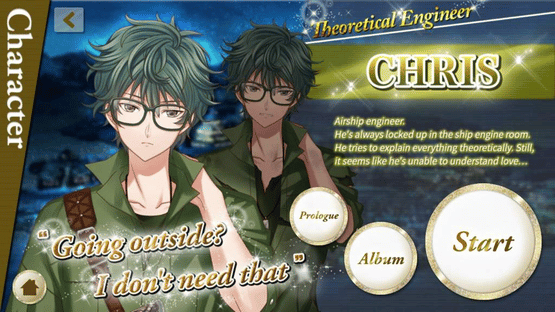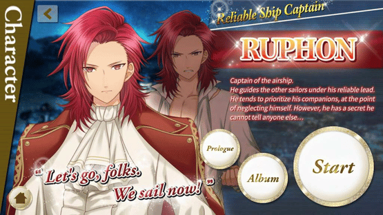 "A big-brother type captain, a four-eyed mechanical engineer, a gentle bodyguard and a nasty chef… The unique crew of the airship is badly injured! They're about to sail off once again, but as a doctor, you can't let that happen!" Available in the Otome Games Romance Box app.