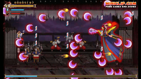A side scrolling shoot-em-up with a feudal Japanese, mythological/sci-fi aesthetic.