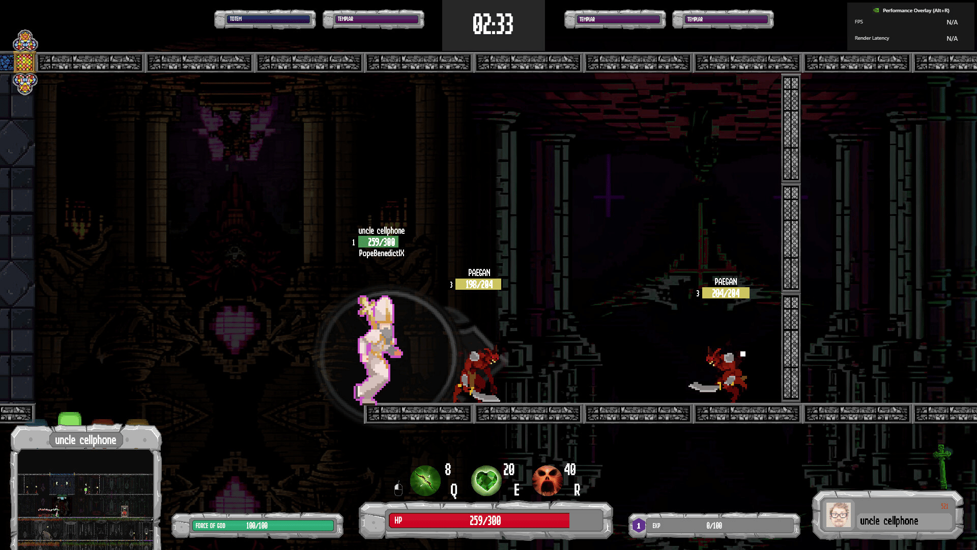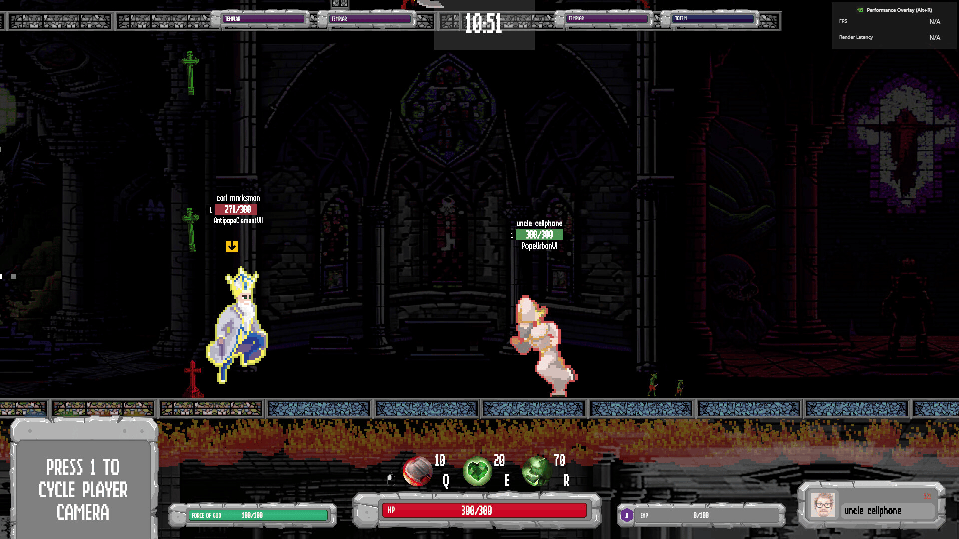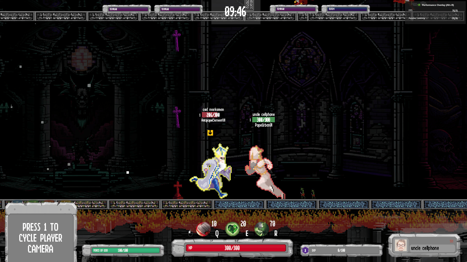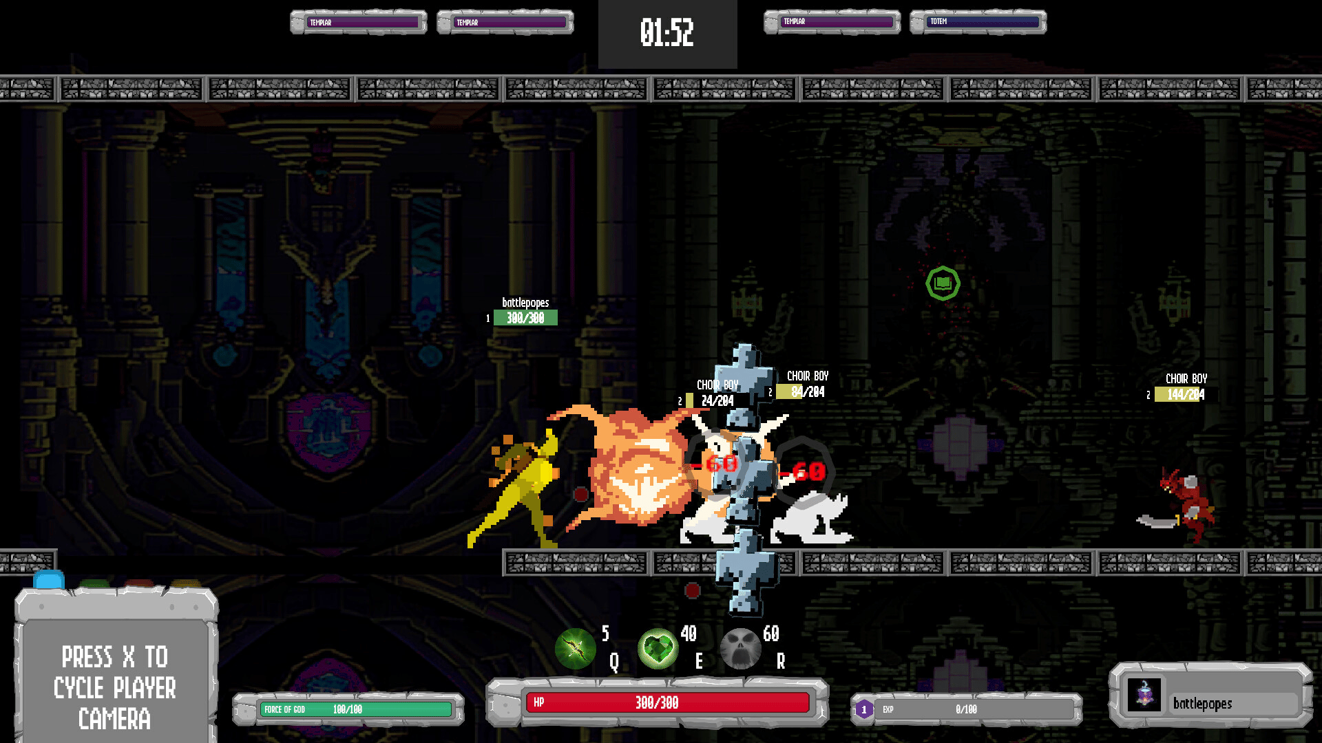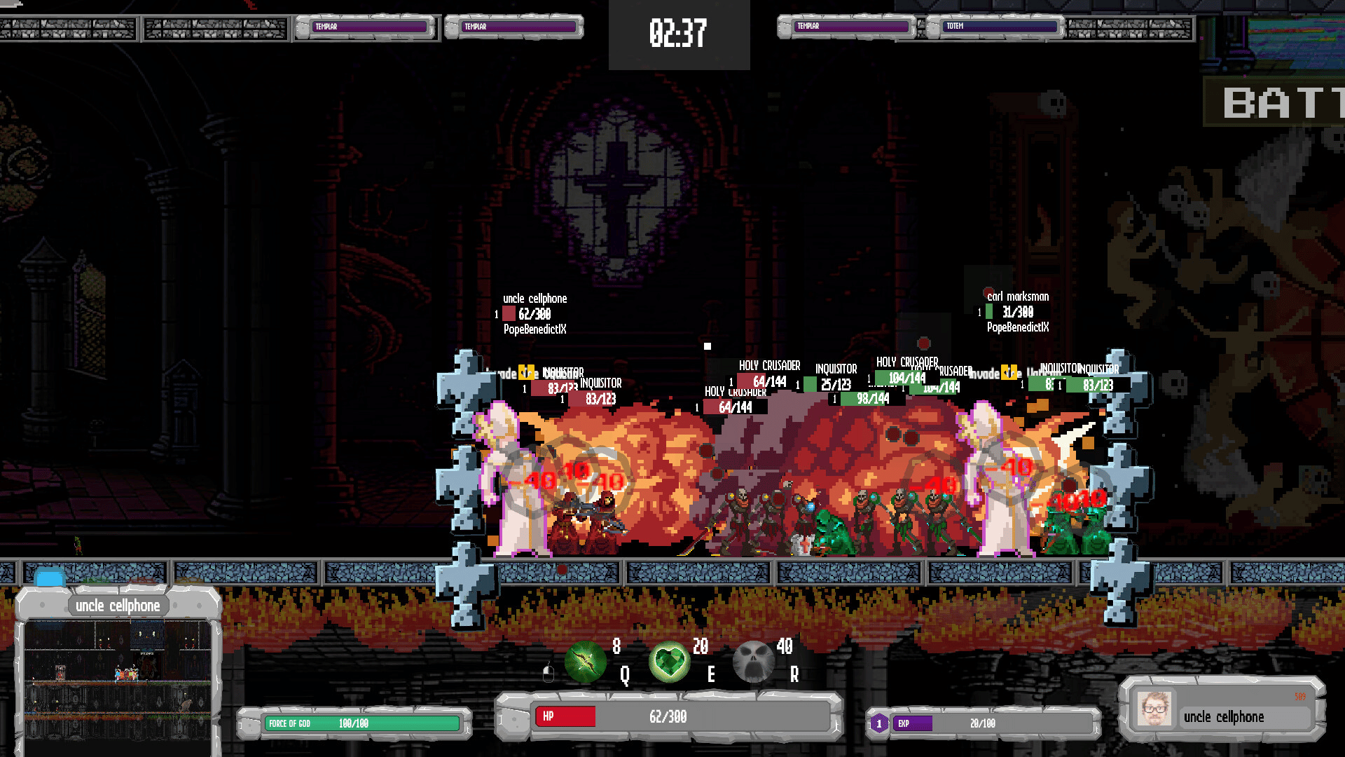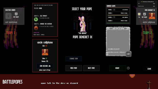 Battlepopes is a multiplayer online 2D MOBA in a sidescrolling arena, featuring cooldown-based combat. Stuck in hell forever, as punishment for their wicked lives, ancient Popes and Antipopes fight in the eternal inferno. Come rot.