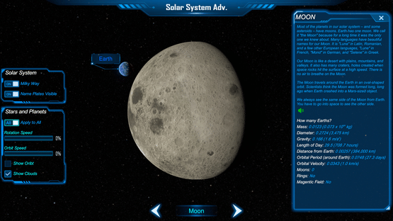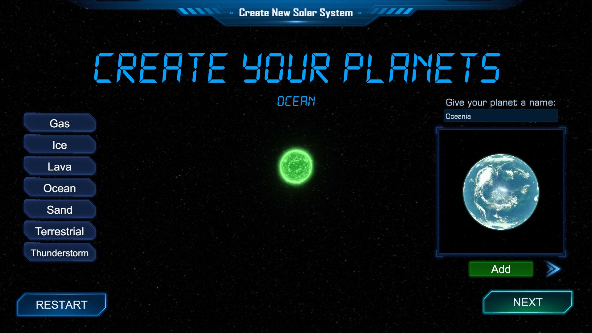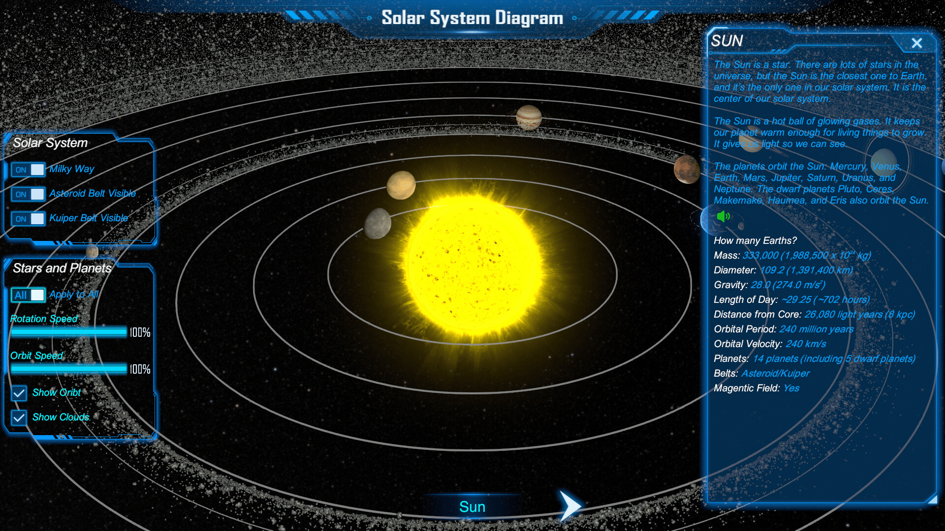 A family friendly casual game that teaches children about celestial bodies. Learn about the Sun, Earth, Jupiter, and the other celestial bodies that make up our Solar System. You or your child will also be able to create your own Solar System in a sleek and in-depth fashion!