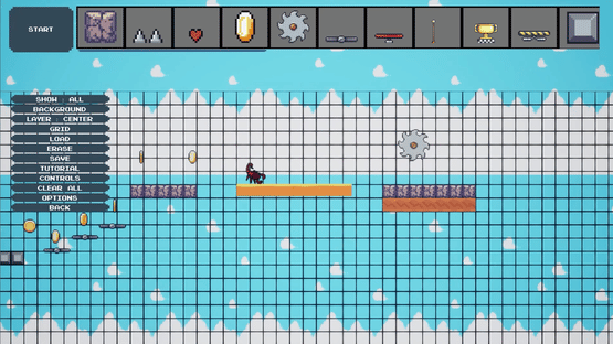 Platform Game Maker is exciting tool to make your dream Platformer Game! You can choose from many many pre-made blocks, sprites and other 2D assets and place them in your levels, and then add several different type of monsters to play and test your own levels. Choose different backgrounds and ornamental sprites to populate and visually enhance your levels. There are several main characters to choose from, each can be the hero of your levels You can also add many health pick-ups, different obstacles as well. Place check-points if your levels are too difficult to complete in one run. Don’t forget to put your end-level award at the end of your levels!