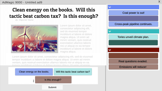 When a sudden election rocks the country, whose side are you on? In Civic Story, you'll encounter colourful characters and situations that show how the upcoming election affects you, your colleagues, and the nation in this satirical and insightful 8-chapter Visual Novel about our world today.