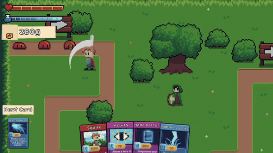 Defenders of Cardom is a traditional tower defense game blended with deck-builder roguelite elements. Build your deck, play your cards right, and hone your strategy to defend against waves of enemies!