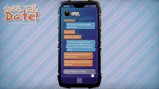 'Match, Talk, Date!' is a dating sim where you use a dating app to chat to a diverse cast of characters. You decide what to say and how the conversation goes. Can you convince them to go out on a date with you, or are you going home alone?