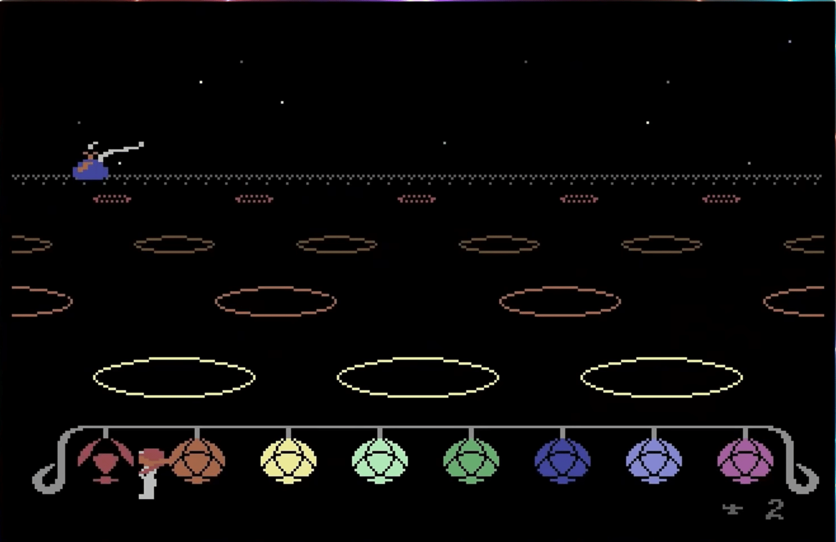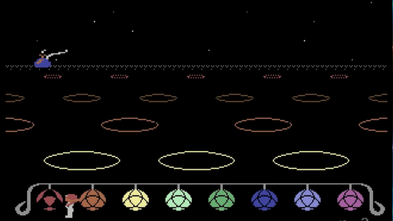 Master of the Lamps is one of the first music video games. It was inspired by tales compiled in One Thousand and One Nights. Gameplay alternates between two modes. In the first, the prince maneuvers a flying carpet through a winding tunnel to a genie's den. In practice, this requires the player to direct the carpet over diamond-shaped gates as they appear; failure to do so returns the prince to the beginning of the tunnel