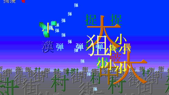 A unique side-scrolling shooting game in which all the graphics other than the background, such as your own plane and enemy planes, are written in kanji. Players use lock-on lasers and regular bullets to complete a total of 7 stages with a wide variety.