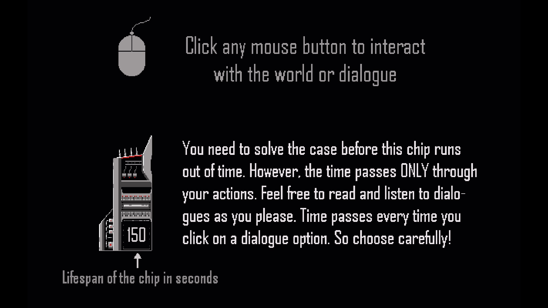 You need to solve the case before a chip in victim's head runs of out time. However, the time passes ONLY through your actions. So feel free to read and listen to dialogues in your own pace. Time passes only when you click on a dialogue option. Time is limited so choose wisely!