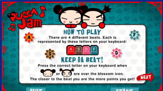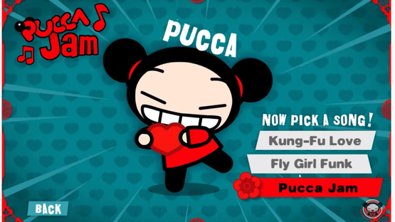 Pucca Jam is a fan made flash game. Press the correct letter on your keyboard when Pucca or Garu are over the blossom icon. The closer to the beat you are the more points you get!" Their is 6 levels in total (3 levels per character).