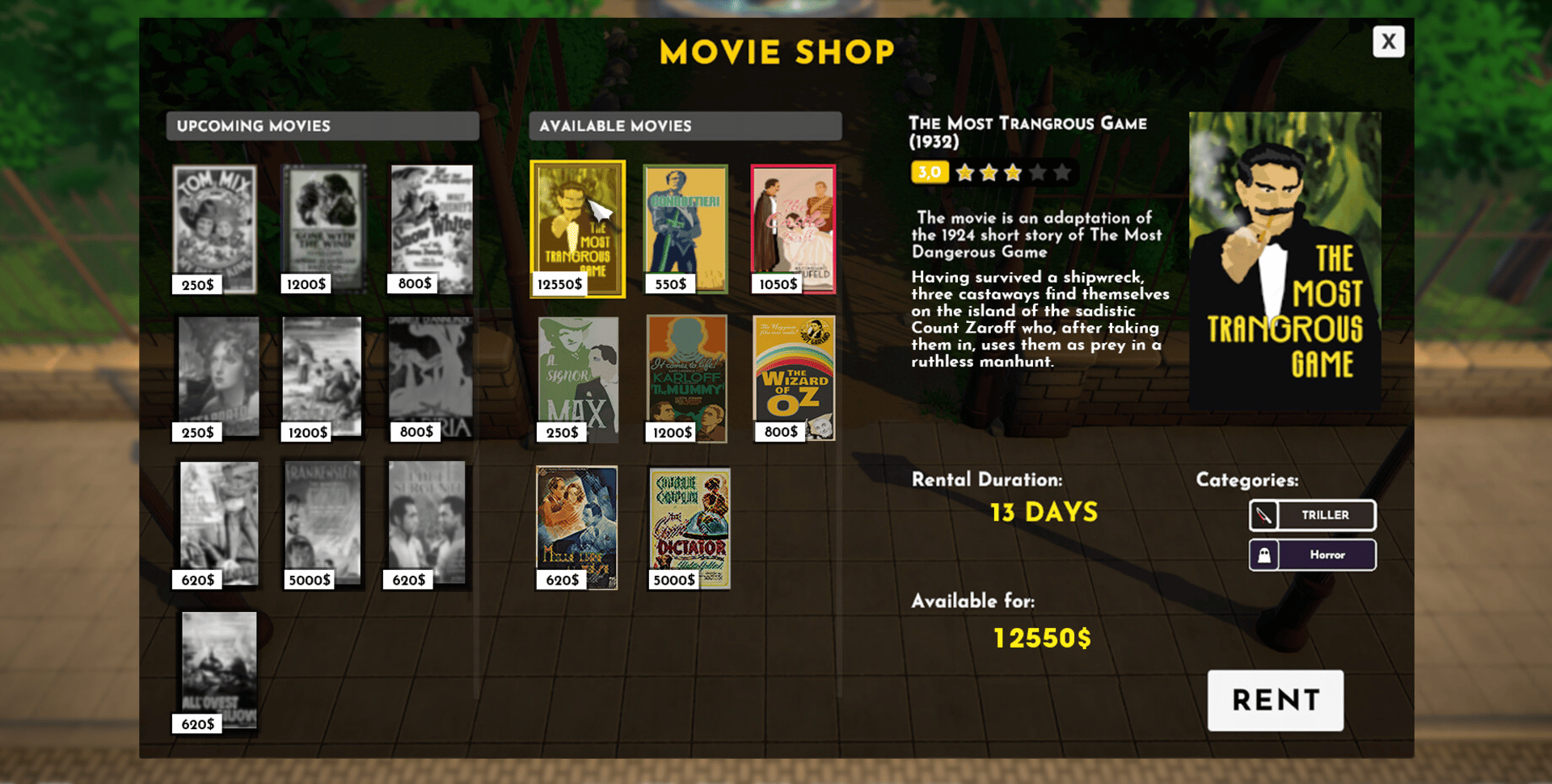 Become the manager of your own Cinema in this thrilling new Tycoon! Through space and time, explore the various aspects of handling a thriving business. Manage movie choices and screenings, staff, rooms, and more!