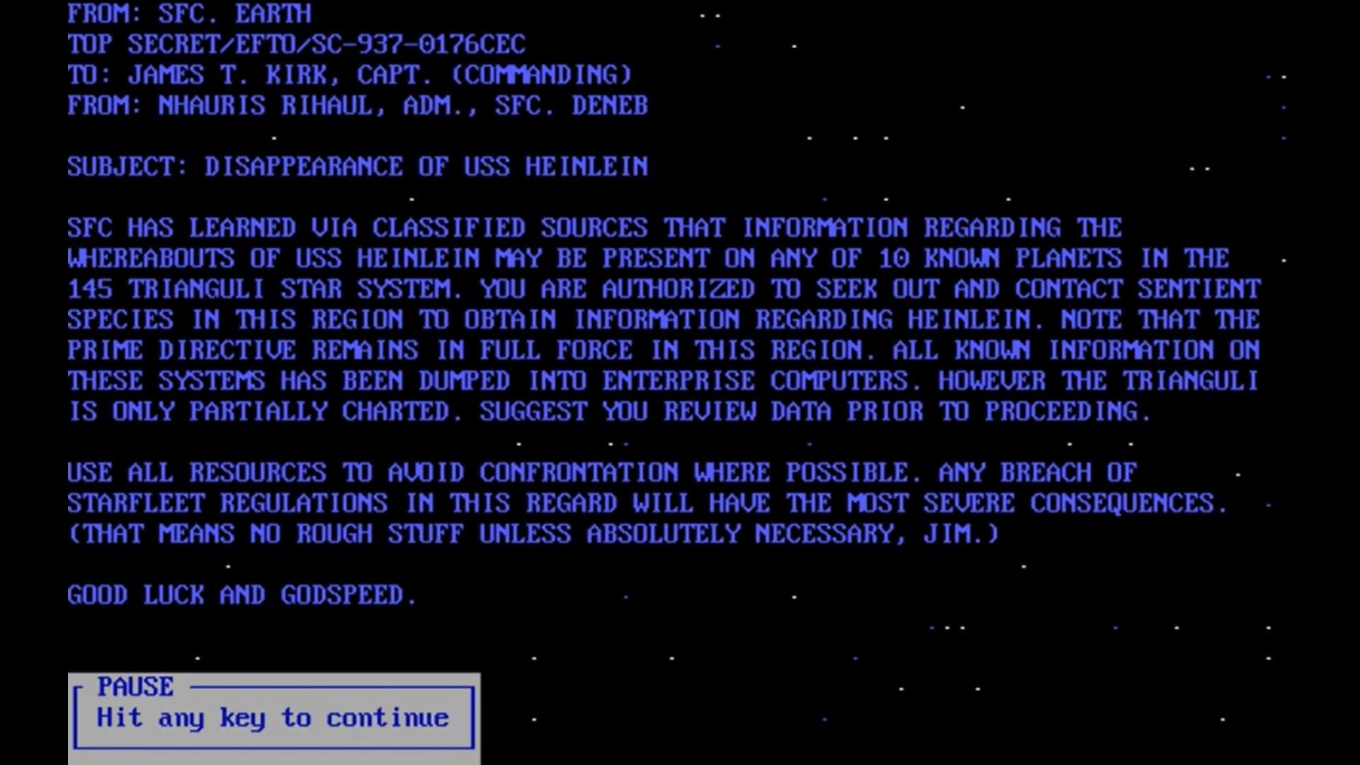 You replay the recovery of the USS Heinlein, which was under the command of Captain Sulu when it got lost under suspicious circumstances in the 145 Trianguli area while on a classified mission. The main reason for simulating the incident is to ascertain if the rescue mission is a viable alternative for the Kobayashi Maru training mission for space cadets at Starfleet Academy.