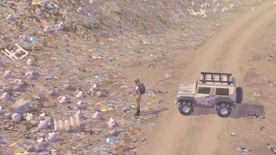 Drive through a pixel art 3D wasteland. Explore vast procedural terrains dotted with hand-crafted landmarks, each holding echoes of a forgotten past.