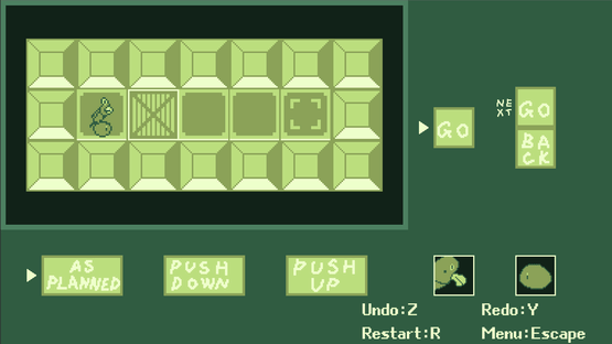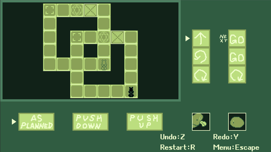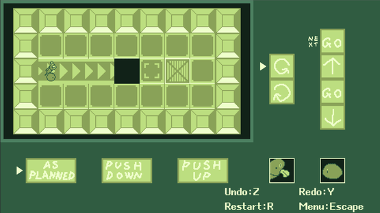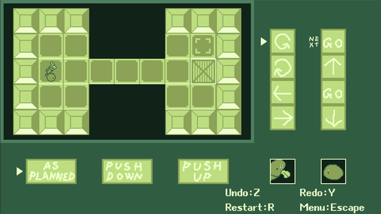 "As Planned" is a puzzle game in which players give a limited number of instructions to a slime that repeats the same movement to move boxes to specified positions.