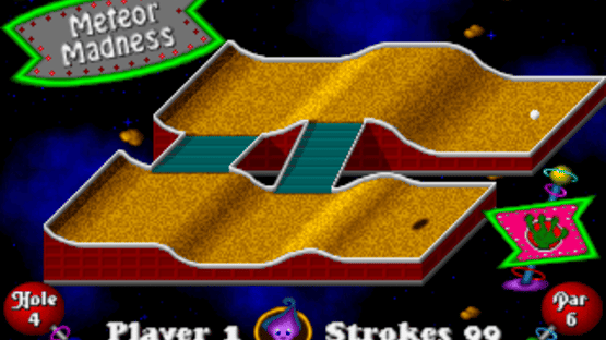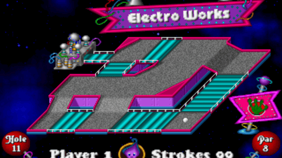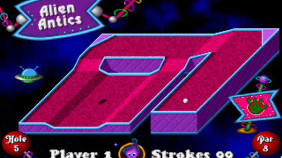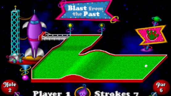 A cartoony, highly animated space-themed mini-golf game for MS-DOS with 12 courses.