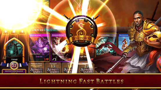 Storm Wars is a collectible card strategy game which focuses on lightning-fast battles with deep deck-building strategy. Battles are fully automated, and resolve as quickly as you wish to view them – for fans of Magic the Gathering or Hearthstone, it's a whole new kind of 'rush'! •Lightning-Fast Battles• Epic battles in under a minute! Build your custom army, choose an opponent, and watch the chaos as the battle unfolds. •Deep Deck-building Strategy• With over 150 unique cards to choose from (each with their own stats and special abilities), 12 powerful heroes, and no deck building limits, the strategic possibilities are endless! •Immersive Campaign• Explore a detailed fantasy universe complete with 6 distinct races and an extended single-player campaign. •Intense PVP• Face off in ranked matches against opponents around the world in the Arena, participate in daily tournaments in the Gauntlet, or engage in direct challenges with others.