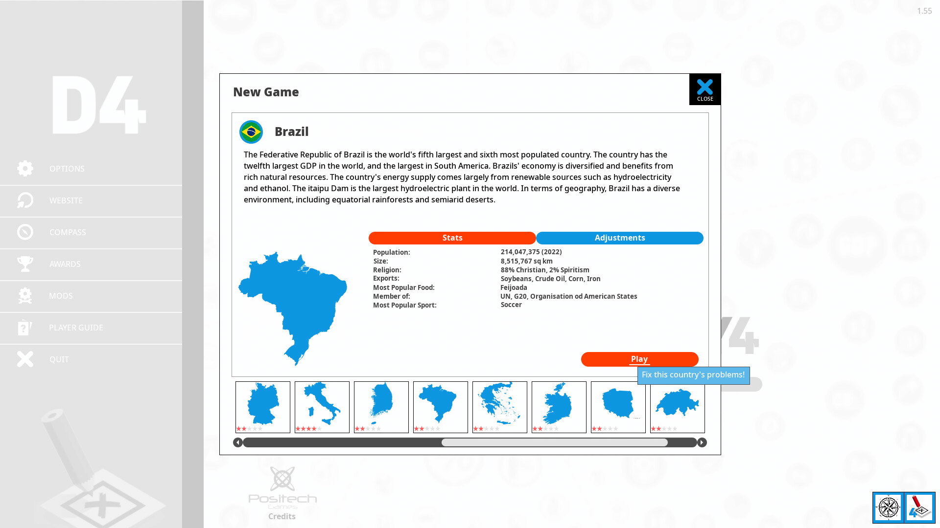 Democracy 4 - Country pack adds six new countries to the game for you to govern: Greece, Ireland, Switzerland, Poland, Turkey and Brazil.