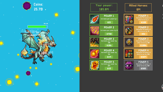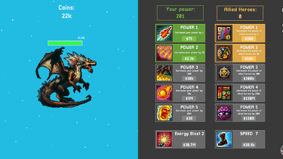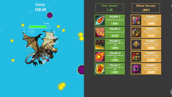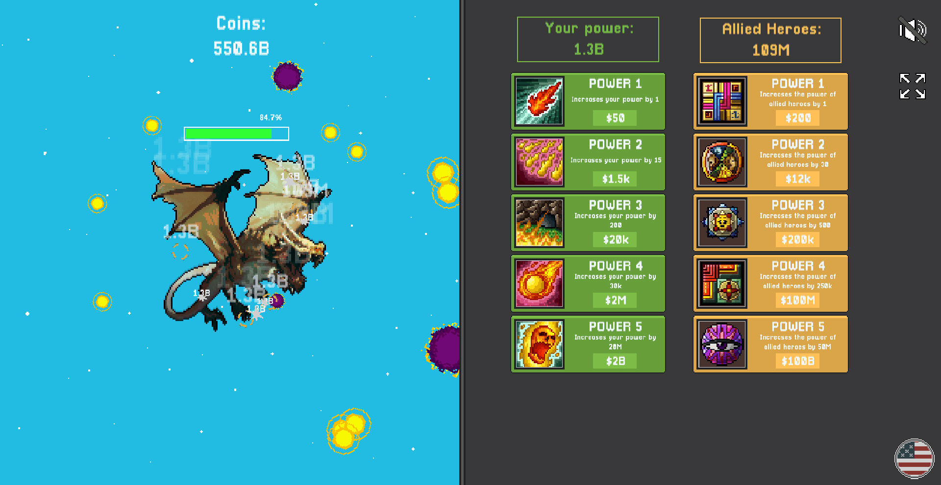 The land has been overrun by evil dragons It needs a leader to bring peace to the land. Start by clicking on the dragon to kill them, and collect coins. Spend that coin on your power and allied Heroes to get more damage. The more damage you deal, the more coins you will get.