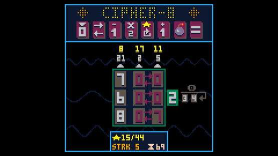 Cipher-8 is a brain-twisting minimalist arcade puzzler where you push numbers into a grid and manipulate them with randomly drawn special abilities. Blitz mode is all about frantic combo streaks. In puzzle mode you can analyze every move. Both modes scale infinitely in their difficulty.
