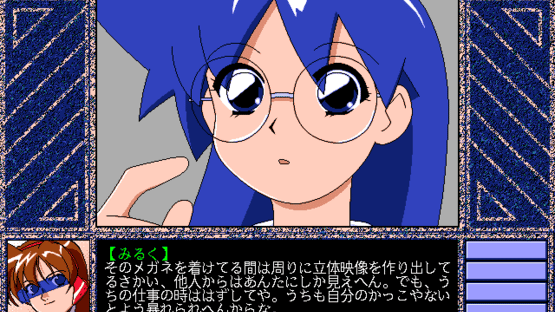 Humanity is prospering through the expansion of the Earth's development, but natural destruction has also become extreme. One day Amon, a scientist who opposed the destruction of nature, decided to return to the Earth 150 years earlier via time machine and protect nature. You follow a time cop from the future, Milk, and an introverted high school girl named Kurumi, who are forced to share the same body by a strange turn of events. They must stop an eco-terrorist named Amon, who creates monsters from plants. This series of short VNs is very short, being constituted of two mere episodes, for a total playtime barely reaching 20 minutes. Nevertheless, it may have the best animated sequences you'll ever see on PC-98. Too bad it was canceled so quickly, it certainly had some potential.