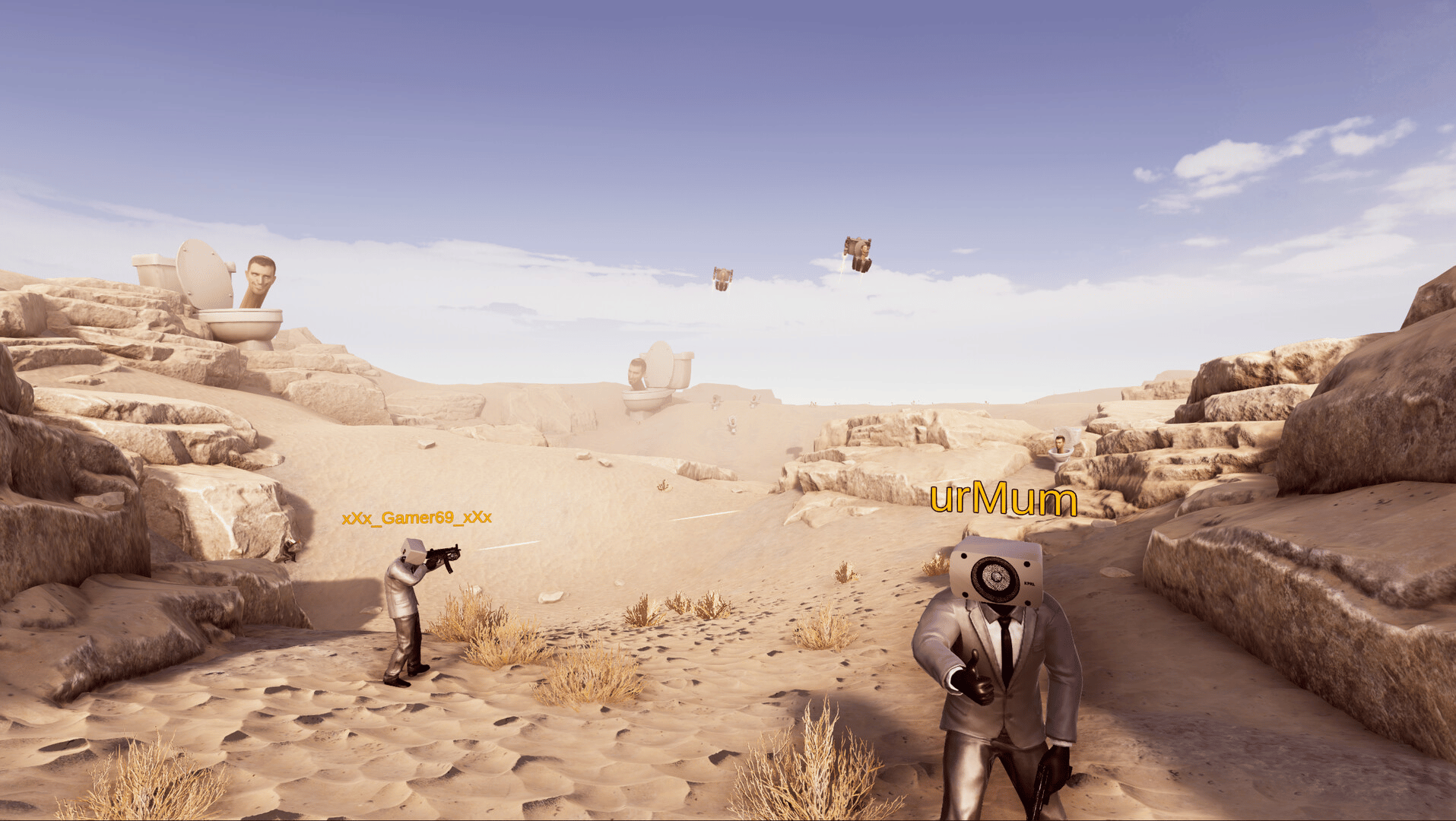 Get ready for a hilariously outrageous multiplayer FPS experience that combines the meme world of the Skibidi toilet with intense action-packed battles! In "Skibidi Toilet Skibidi Boom" you'll dive headfirst into a quirky universe where two bizarre factions clash for supremacy: the eccentric Cameraheads and the wacky Skibidi Toilets.
