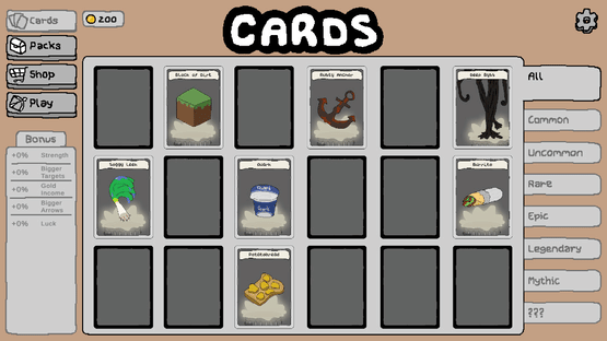 Earn Gold by shooting increasingly harder targets in a 2D Archer Minigame. Spend your Gold in the Shop to buy Booster Packs and try to collect over +200 cards which all improve the abilities of you archer!