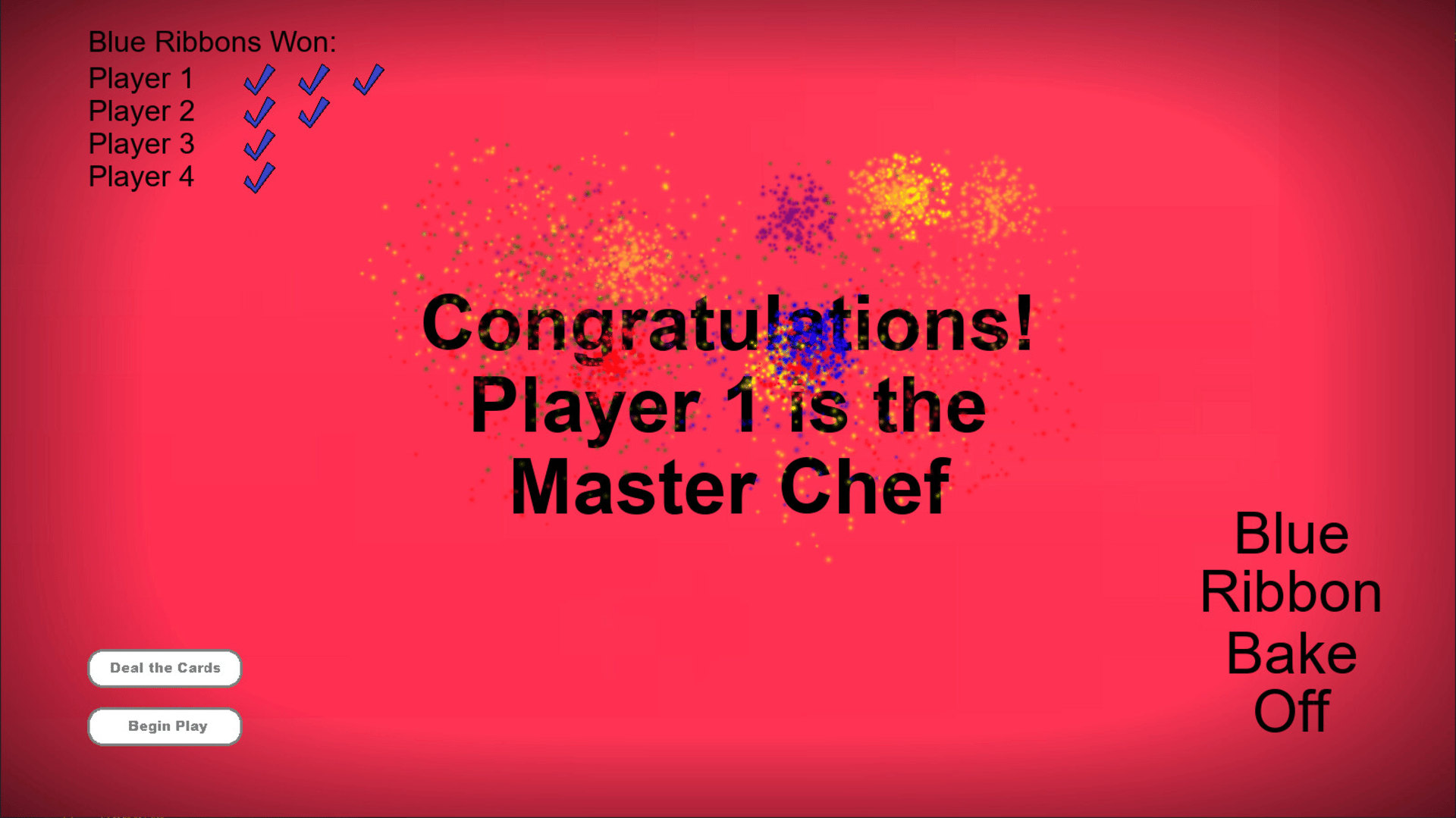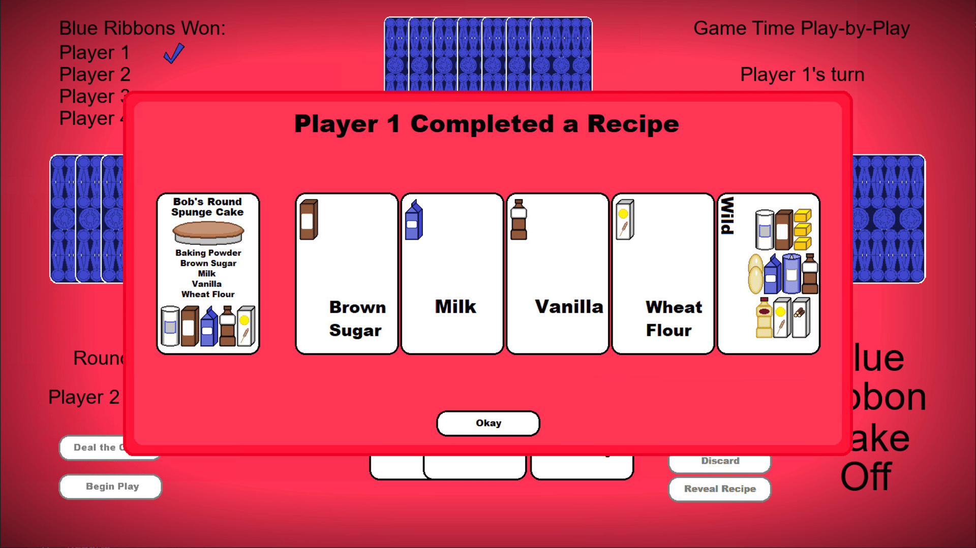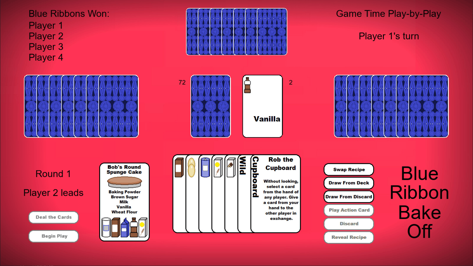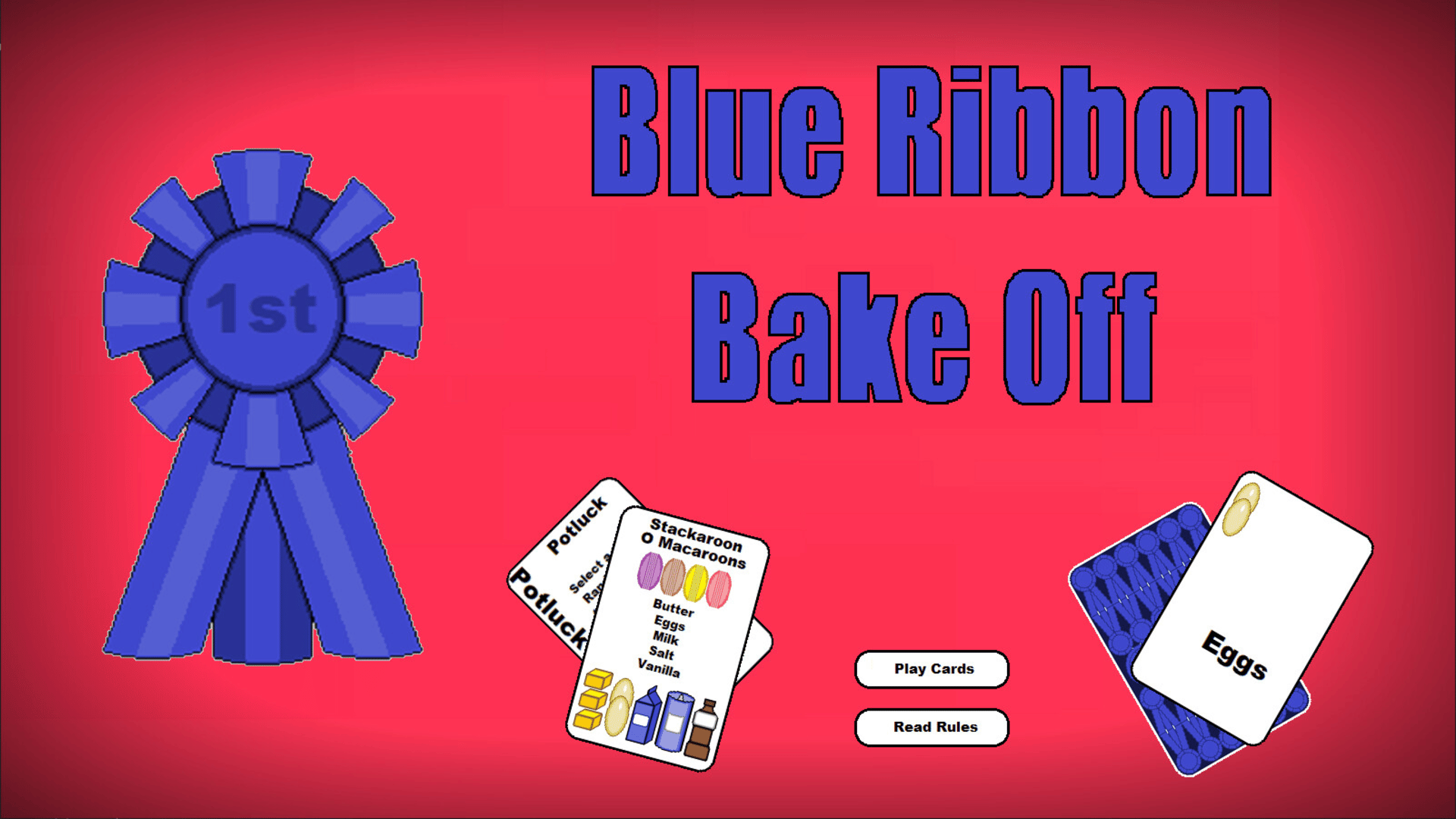 Blue Ribbon Bake Off is a new, original playing card game. Players work to gather ingredients to complete a recipe and win a blue ribbon at the county fair. Competitors use every trick in the cookbook to stop them. Who will be named the County's Best Baker?