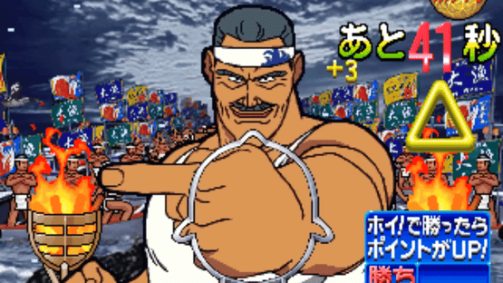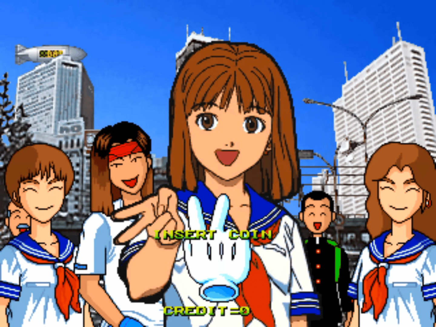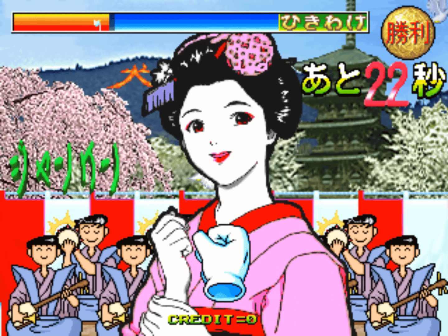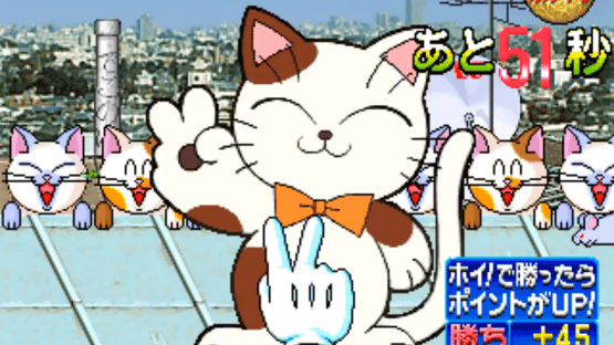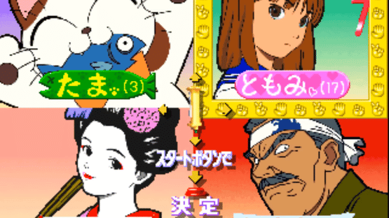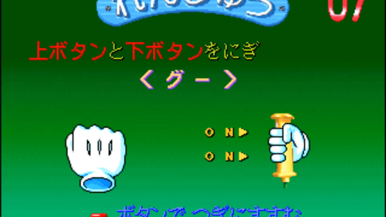 A Janken (rock-paper-scissors) simulator based off the Acchi Muite Hoi! variation of the game, where the player must win a Janken match then correctly guess which direction their opponent will look. The game's cabinet utilizes a unique control setup, with a large joystick with two buttons on it; holding both buttons chooses rock, a single button chooses scissors, and no buttons held chooses paper. The player can pick between four different opponents, with a meter at the top of the screen filling up whenever the player guesses the opponents moves right. Once the meter is full the opponent is defeated and the next in line challenges the player.