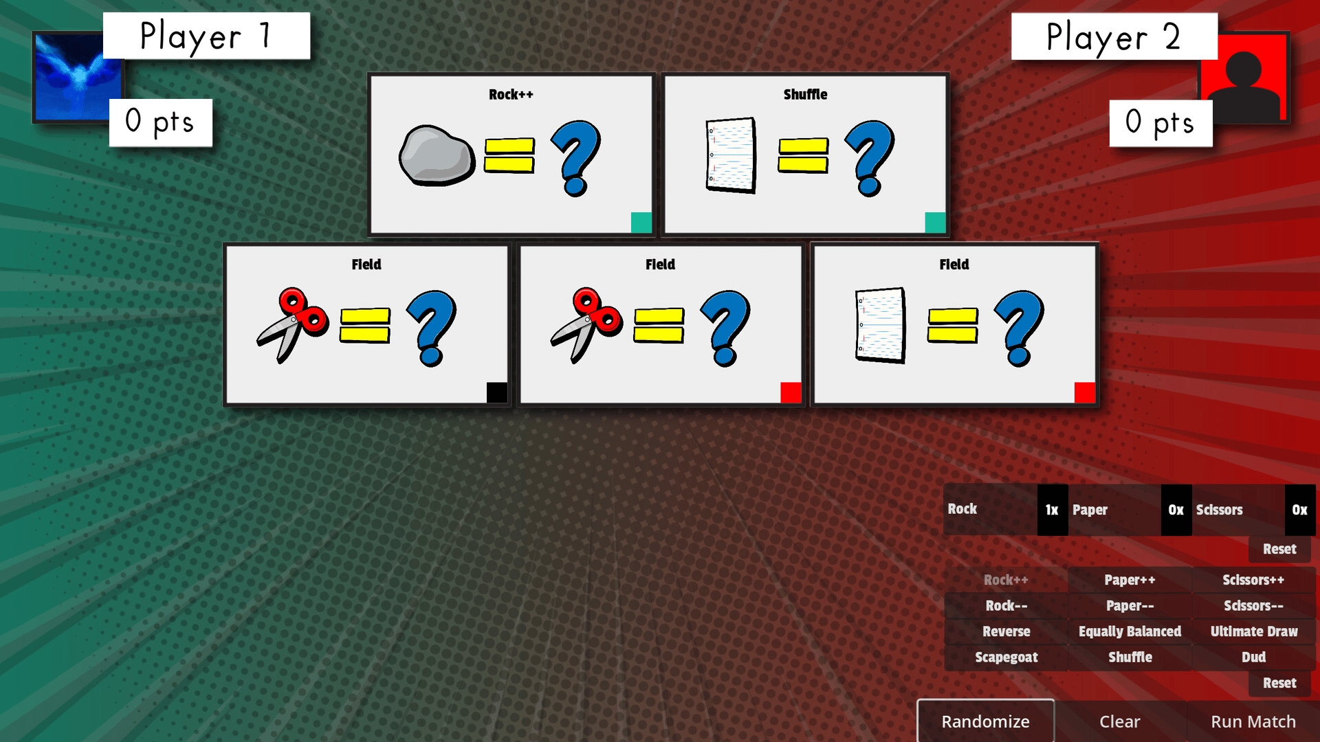 Super RPS is a tactical strategy game in which two players have a series of Rock, Paper, Scissors matches on 5 fields concurrently. Each player has a secondary deck of "Field Cards" that have special abilities that can turn the match in your favor.