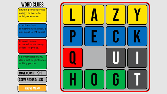 Quadruzzle is an exciting word puzzle game. Each day you will be tasked with solving a new puzzle by guessing four words with clues. To solve the puzzle, you will move 15 lettered tiles into their proper place on a 4 x 4 grid of 16 slots with only one open slot to move tiles into.