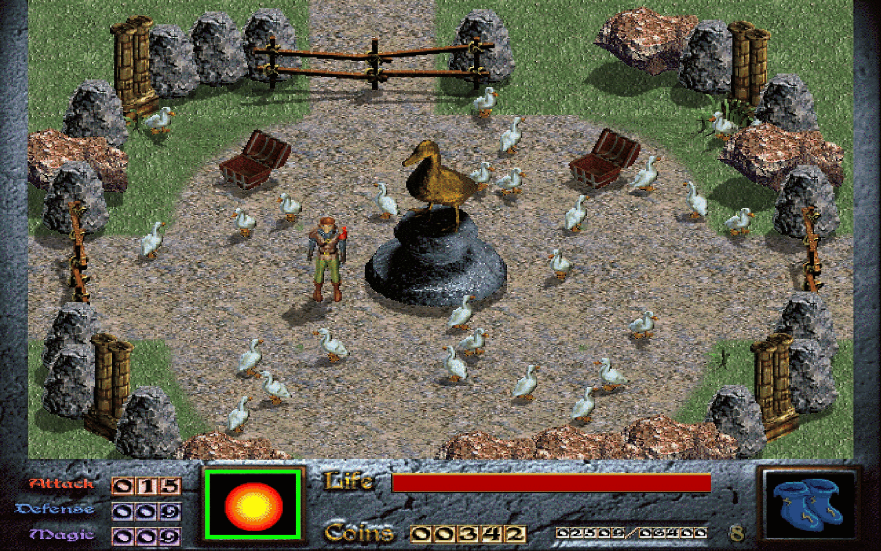 Dink Smallwood is a humorous role-playing video game. It was first released in 1998 before becoming freeware on October 17, 1999. It was developed by Robinson Technologies, at the time consisting of Seth Robinson, Justin Martin, and Greg Smith. Mitch Brink composed several of the game's music tracks, while others are MIDI forms of classical music such as Debussy's Reverie. The game has a small but dedicated fan following that continues to develop add-ons for the game more than a decade after its release. The HD version features remastered soundtrack, new quality of life features, built-in mod support, an upgraded engine, and gamepad support.