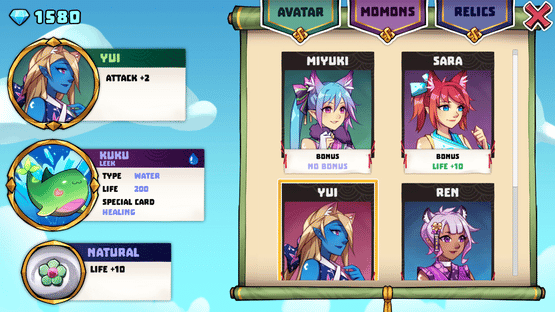 Momon: Relic Seekers is a card battle game with roguelite elements, which takes place in the Tsuki universe. Help Tsuki recover her world, collect the relics, build your deck and fight monsters with the help of your Momons.