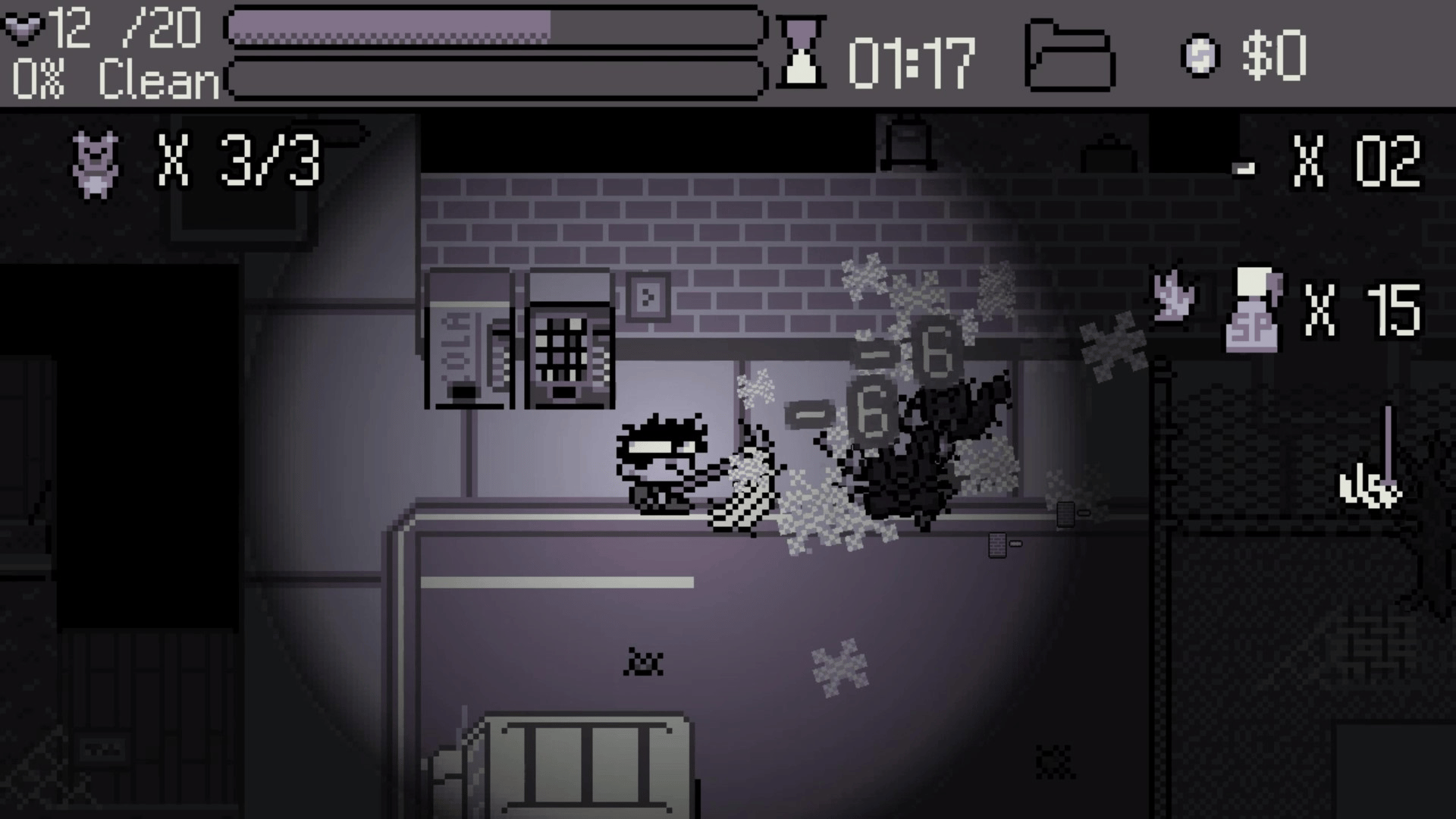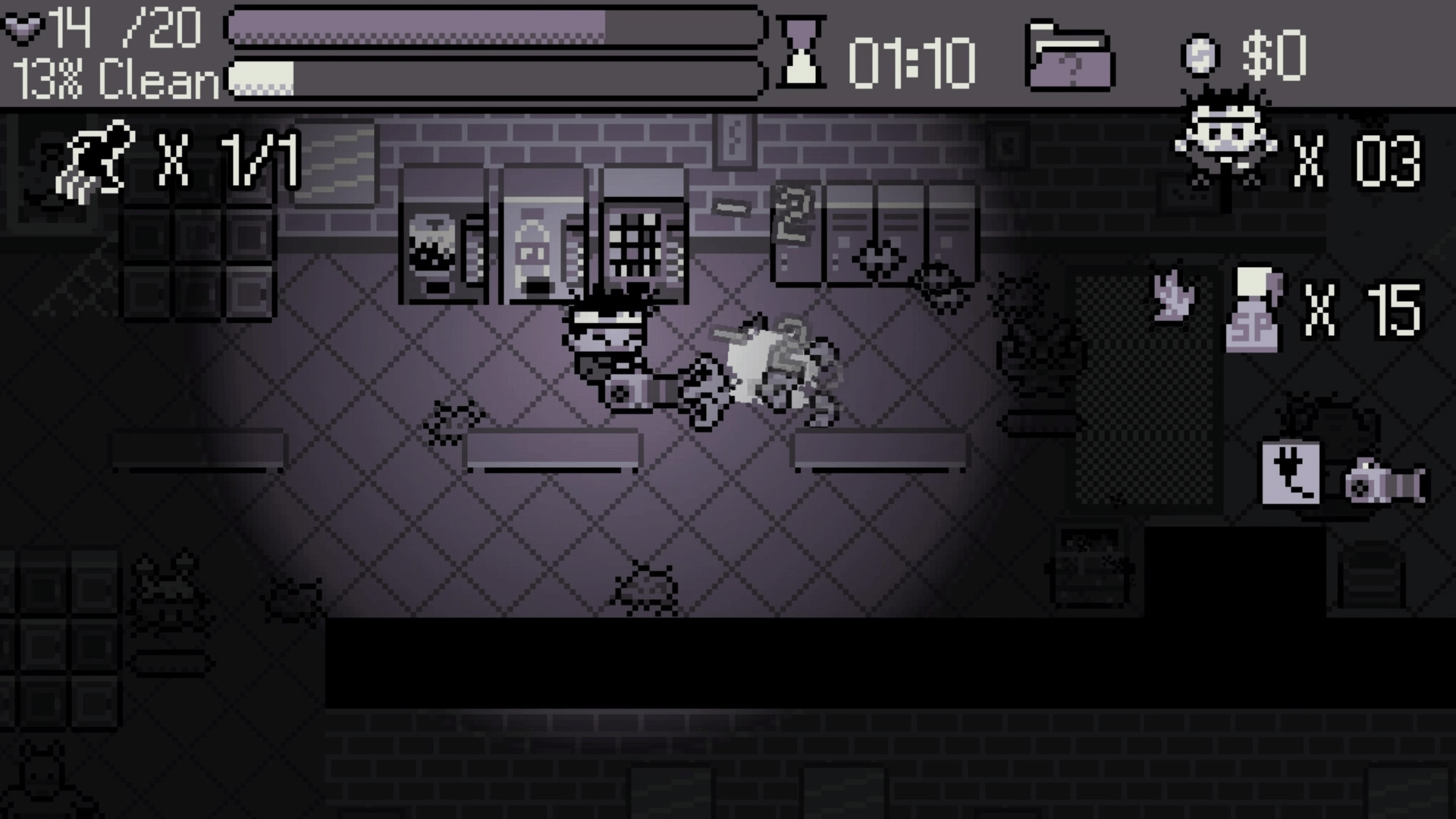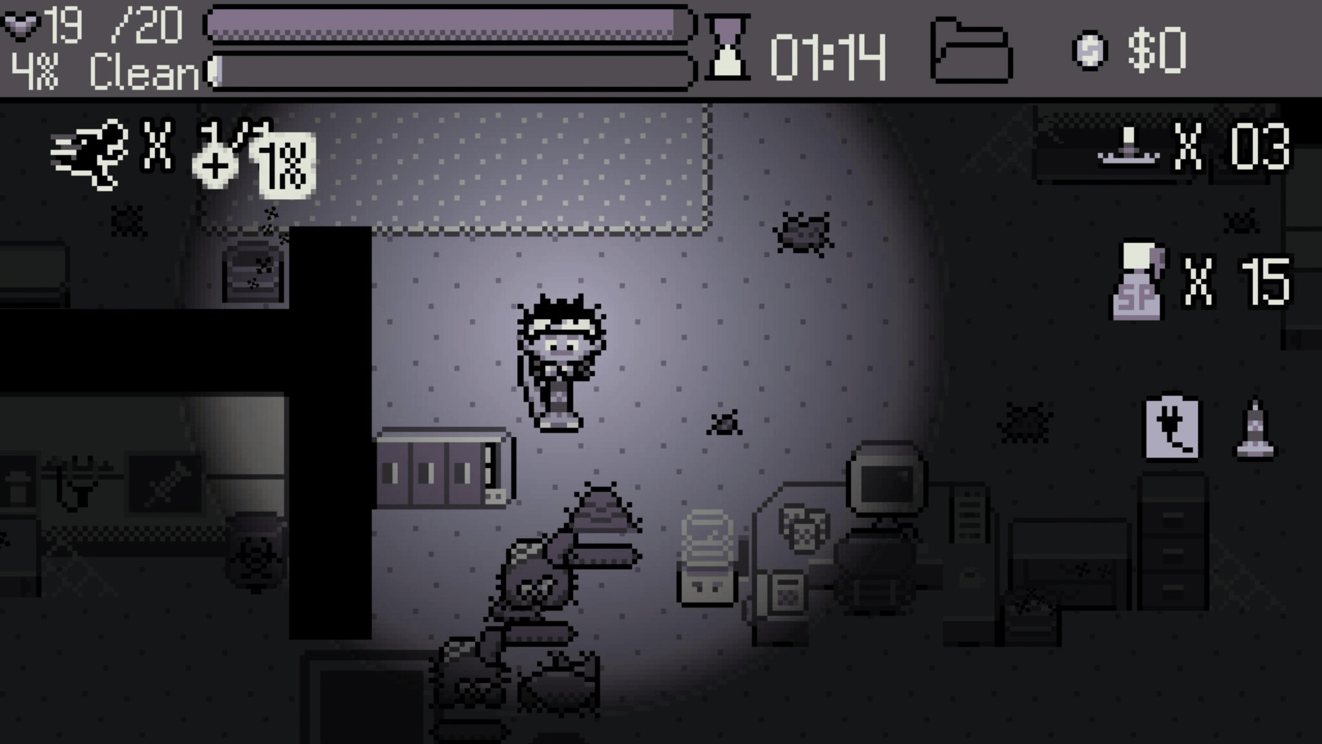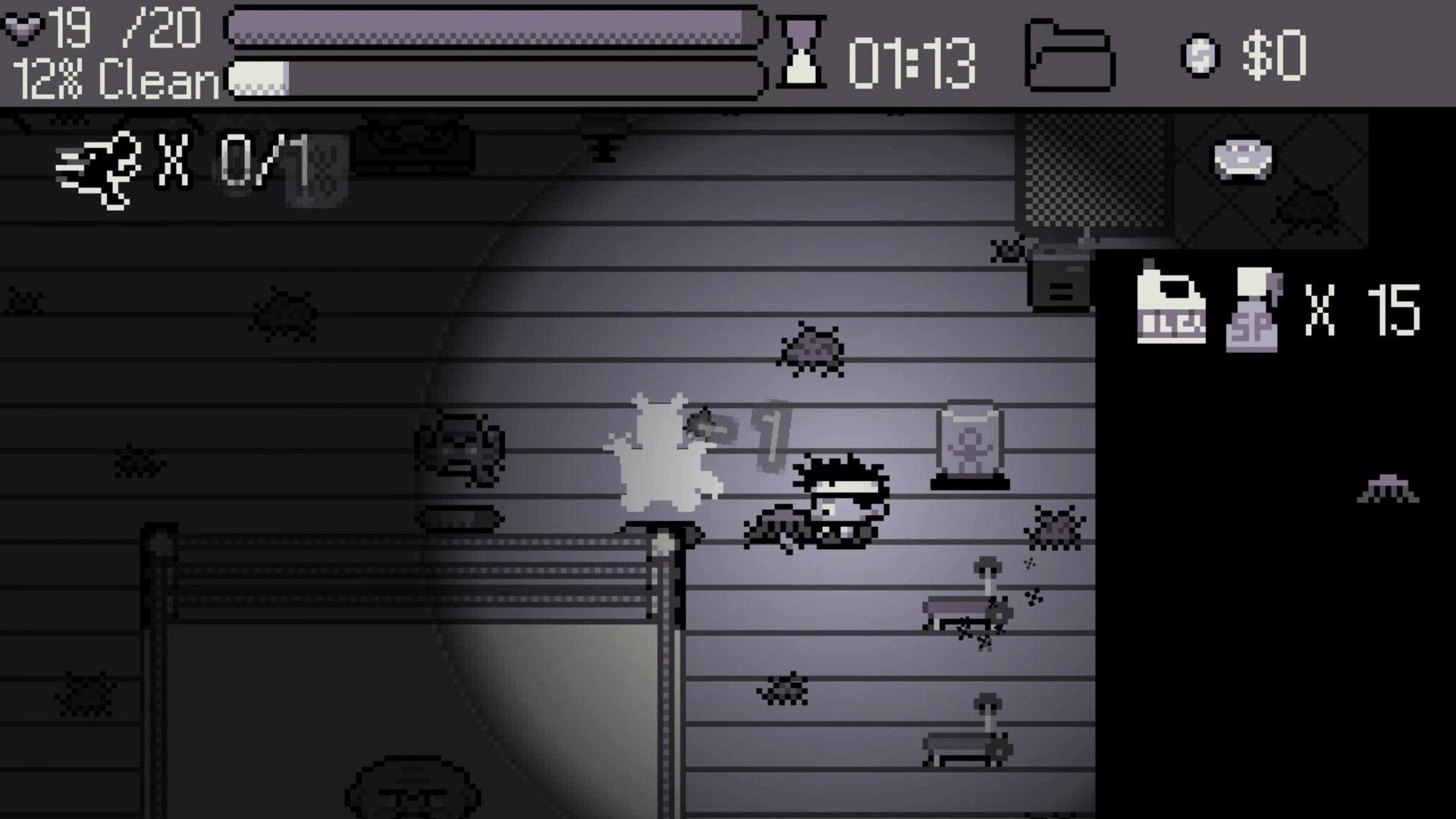 Clean, Clash, and Collect across the crummiest corners of this Single-Player Rogue-Lite. Spend your meager earnings wisely on both permanent and temporary upgrades, so that even the thriving haunts of cute and creepy creatures can’t stop you from cleaning until everything is Spotless!