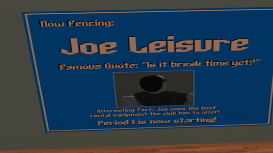 The Brazil Fencing Club has nine world-class foil fencers ready to challenge you. Test your fencing skill and see if it holds up against these wacky fencers. Use actual real world fencing skills in a virtual reality game that closely simulates actual real world foil fencing.