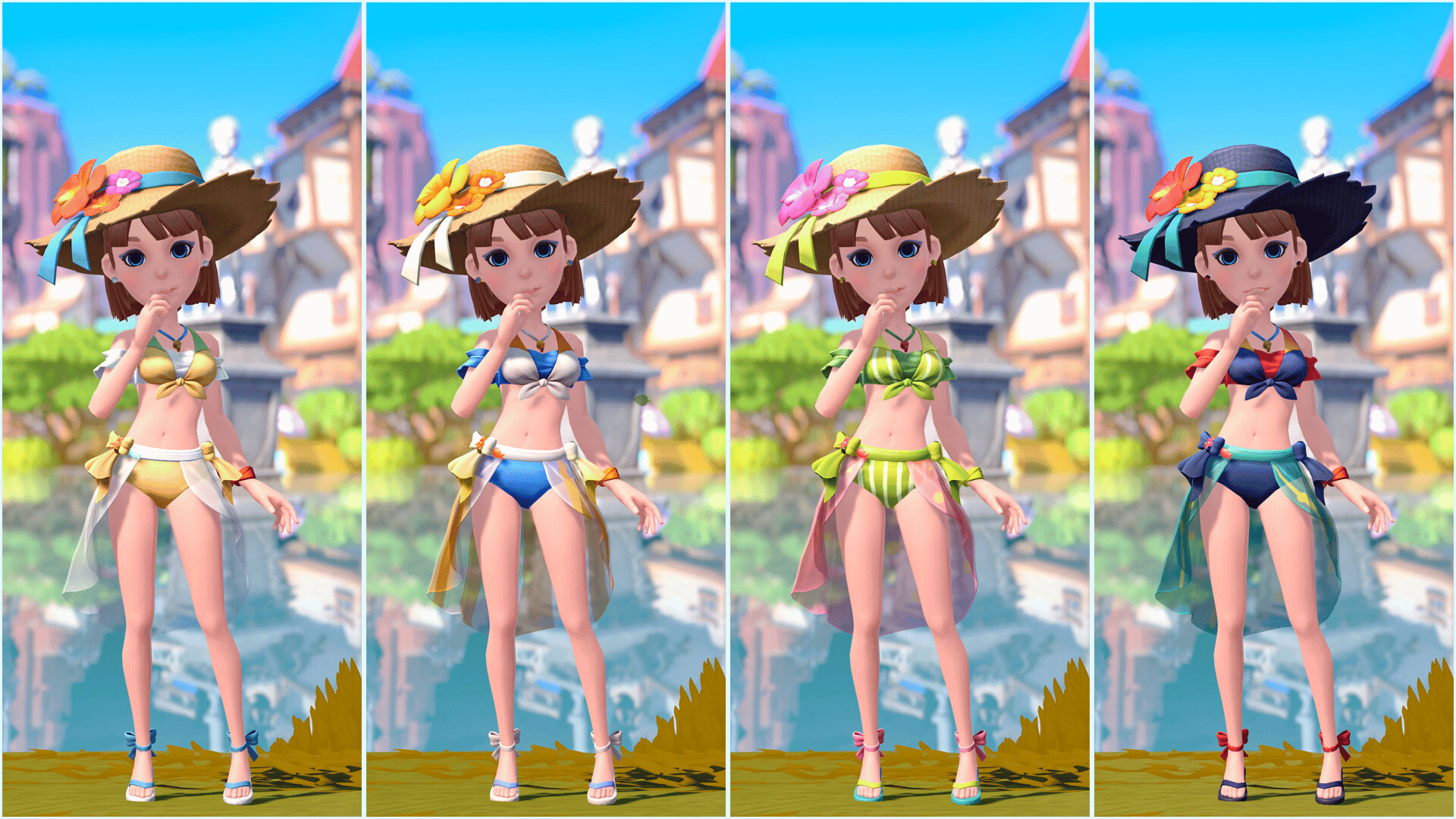 Includes swimsuits and ball attire for your builder; each set comes in 4 different colors that you can mix and match. A set includes a top, a bottom, headwear, shoes, and 3 accessories.