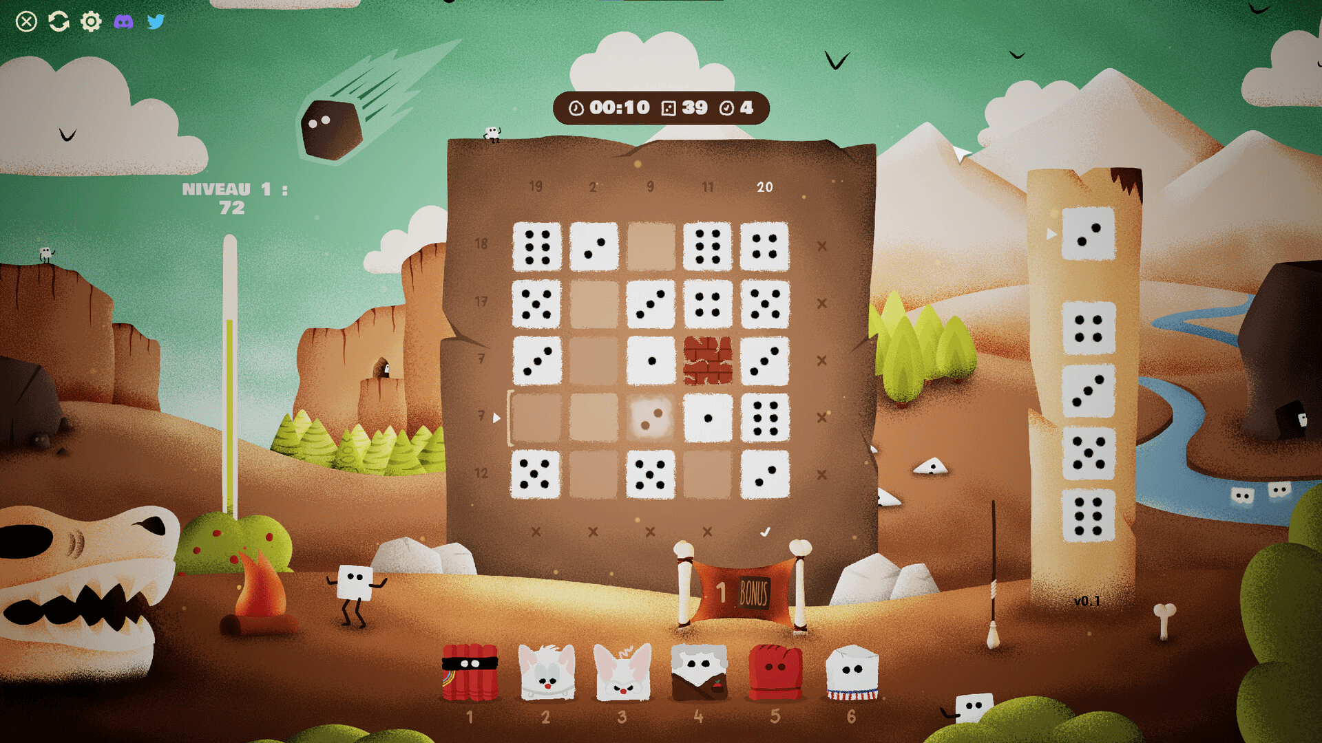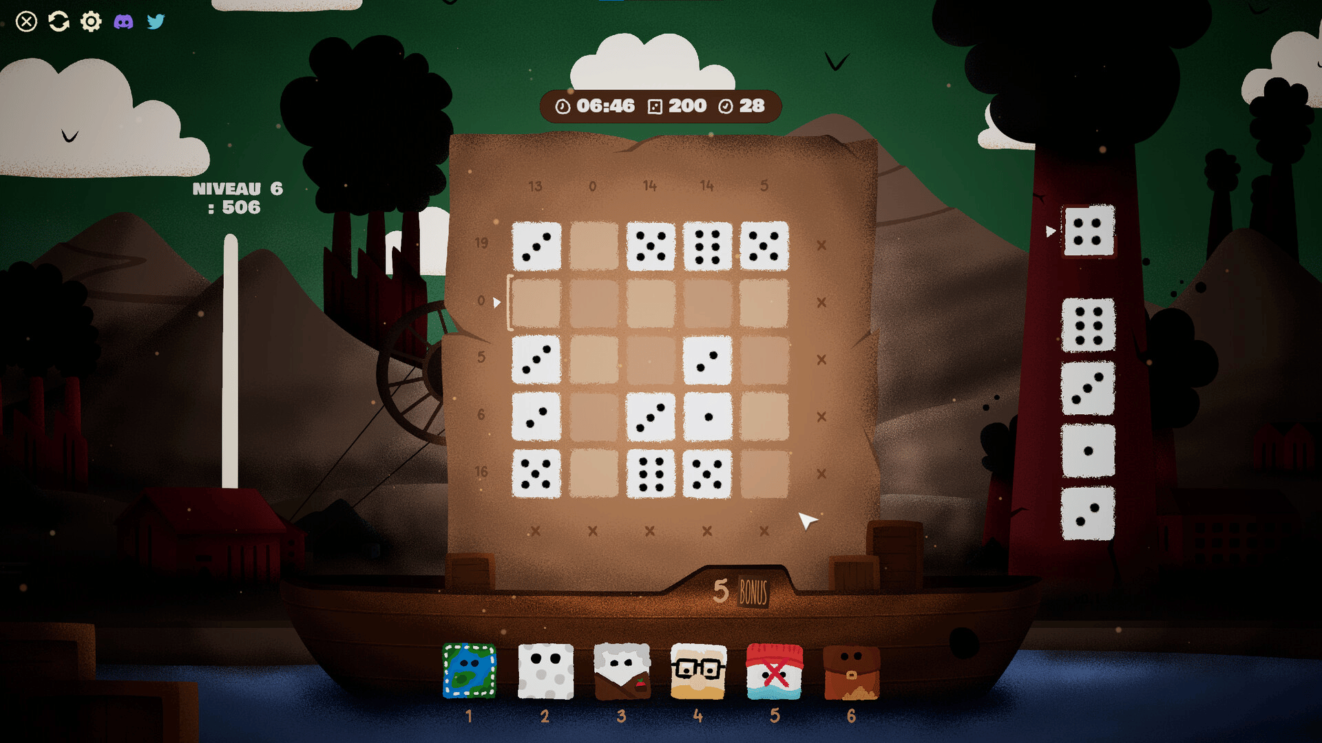 Drop the Dice is a “Side Game” whose goal is to score as many points as possible by placing your dice on the board! Optimize the positioning to obtain similar totals on your rows and columns, increase your score, use bonuses and cross the different levels!