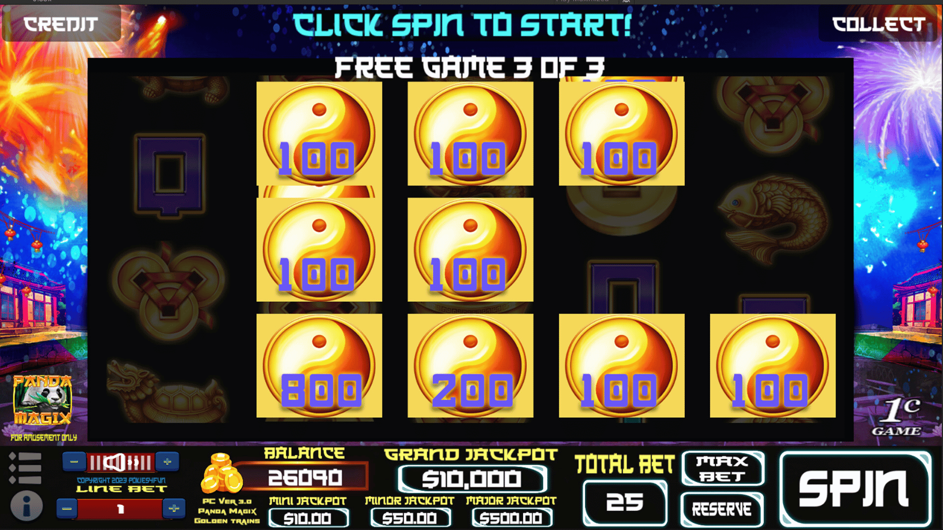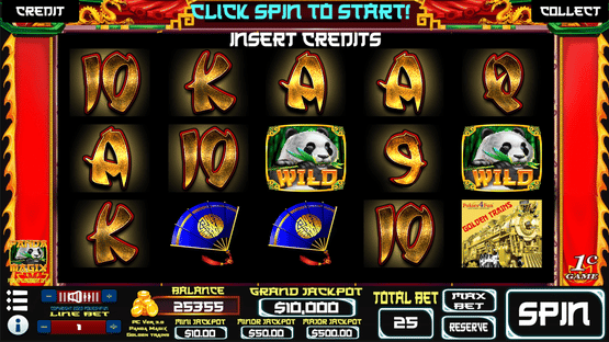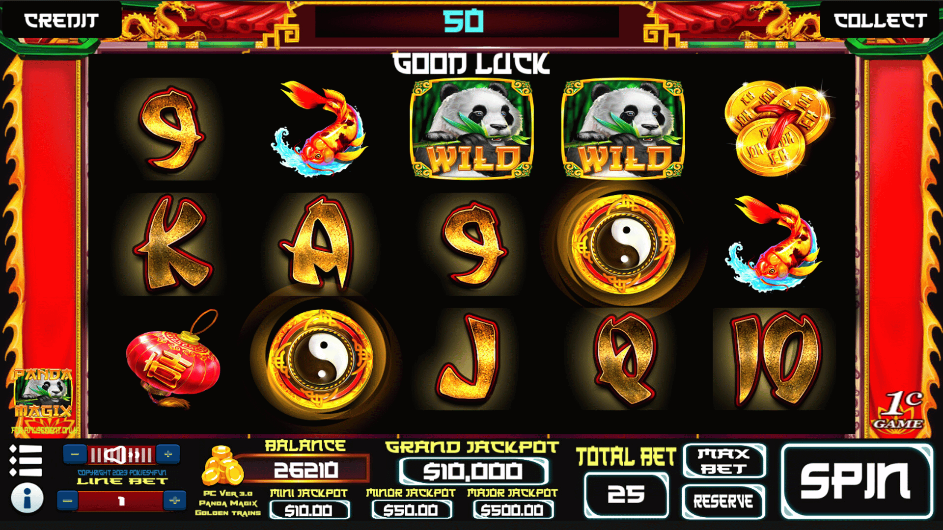 Panda Magix : Golden Trains Edition is a 5 reel, 25 payline slot machine (pokie) with a Oriental theme oriented from left to right.